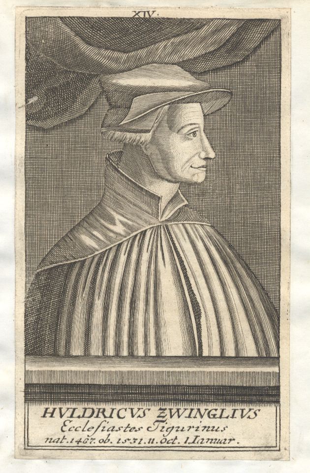 Ecclesiastes Tigurinus nat. 1487[!] ob. 1531 11. Oct. 1. Ianuar ; [Brustbild nach rechts, Kopf im Profil]