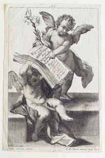 [2 Putten, die ein geöffnetes Buch mit der Aufschrift tragen: Figuren aus Mahlereyen der Vornehmsten Italian. Virtuose[n]]