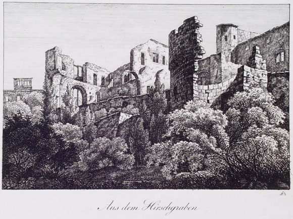 [Teilansicht der Heidelberger Schloßruine vom Hirschgraben aus]