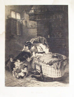 [Kind in Wiege, daneben drei Hunde]