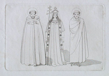 [Junge Frau in langem Gewand mit Stola und Kreuz mit drei Querbalken, rechts und links zwei heilige Mönche, einer stigmatisiert (Franz von Assisi?)]