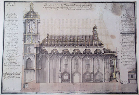 Profil, wie sich die Collegiat-Stifts- und Stadt-PfarrKirche zu Eichstaedt der laenge nach sowohl die alt abkommende, als die neu zuerrichtendt zierlich und thaurhafte Bedachung, dann thurm-aufsaz, und Kuppl praesentiert