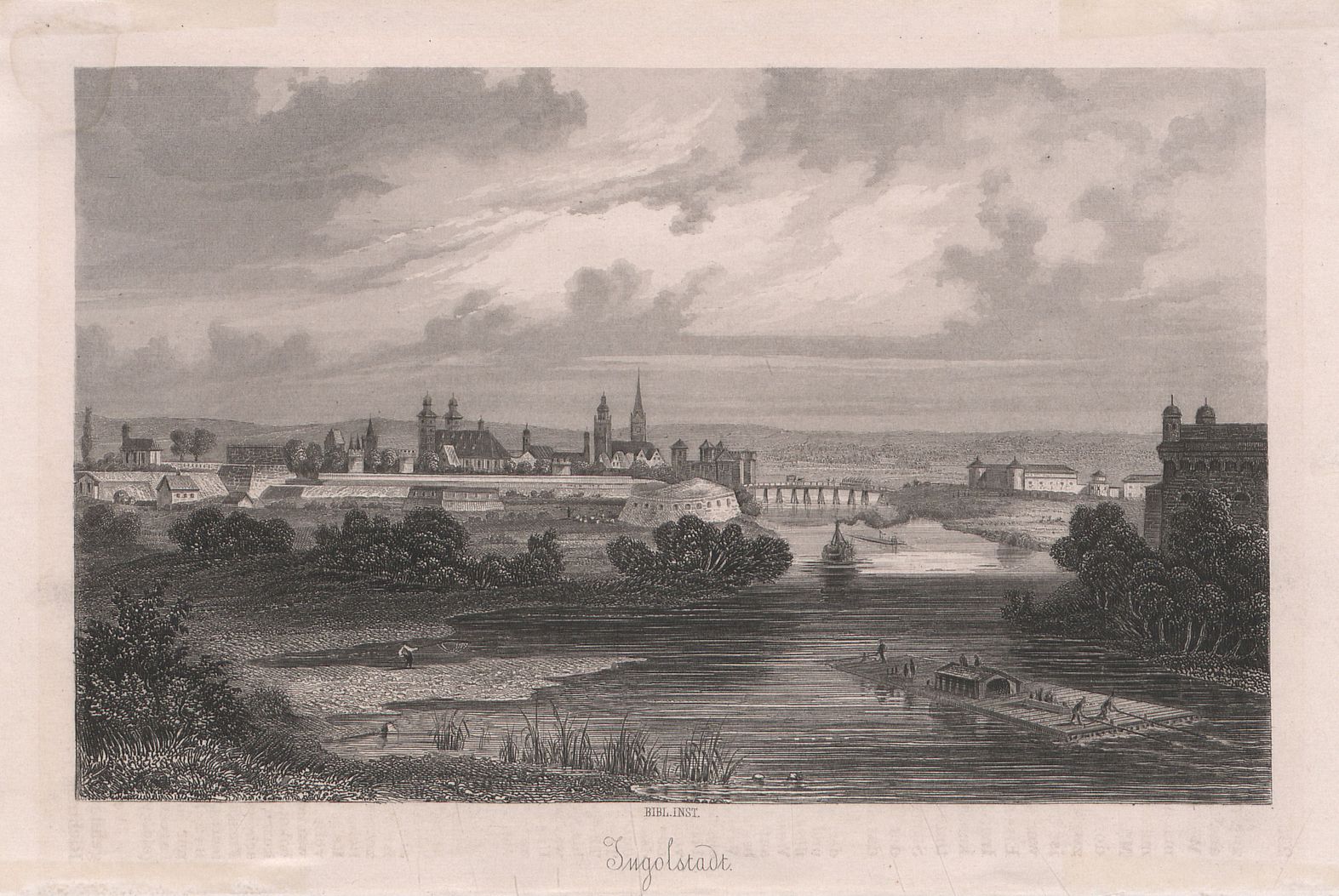 Vgl.: "Ingolstadt in Bayern" [GS(3)3.18.2] aus: Meyer's Universum. - Hildburghausen [u.a.] : Bibliographisches Institut. - Bd. 15(1852), nach S. 18. - Vorliegendes Bl. geringfügig verkleinert und mit geänderter Schrift. - Vgl.: Antiquariatskatalog "Bistum Eichstätt" des Antiquariats Joseph Steutzger, Buch am Buchrain, [1999], Teil "Alte Stiche", S. 4
