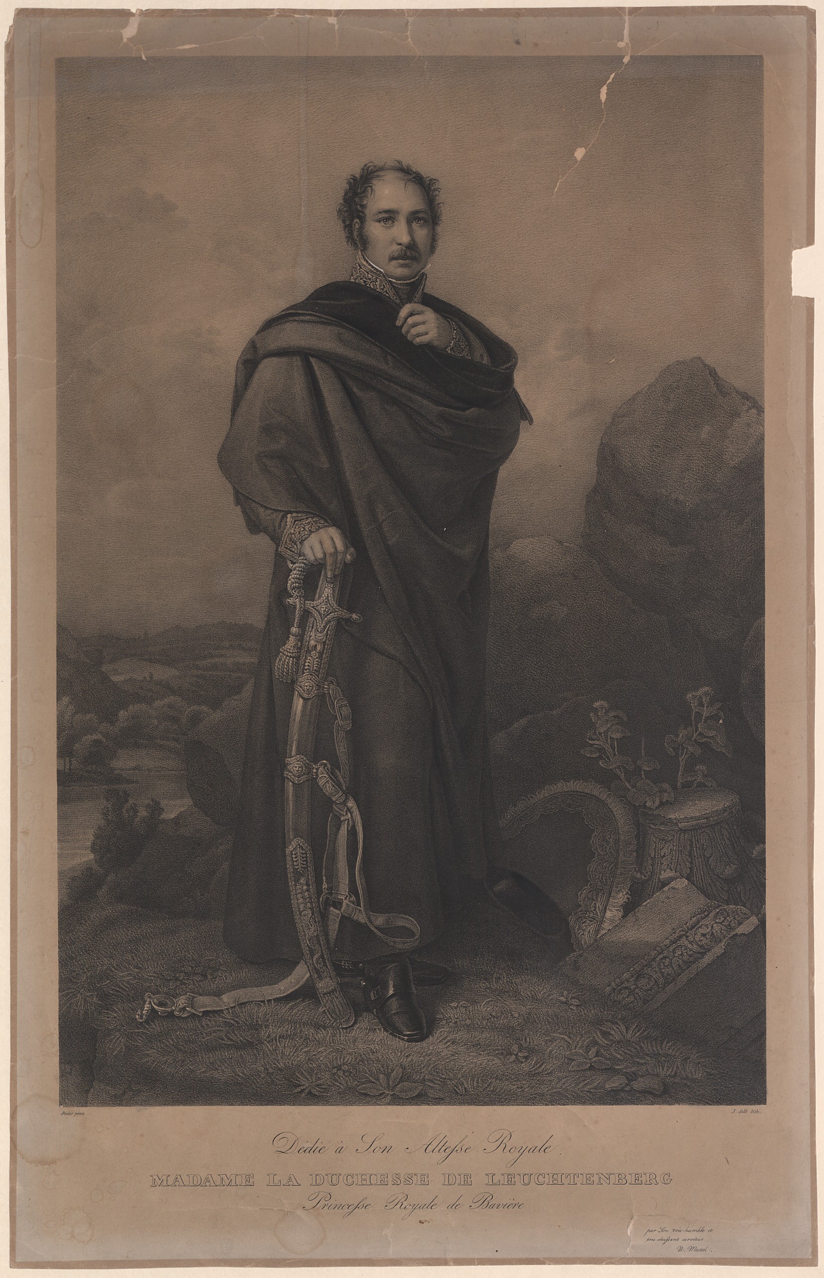 [Portrait von Eugen Beauharnais von Leuchtenberg, stehend mit reichverziertem Säbel in Landschaft]