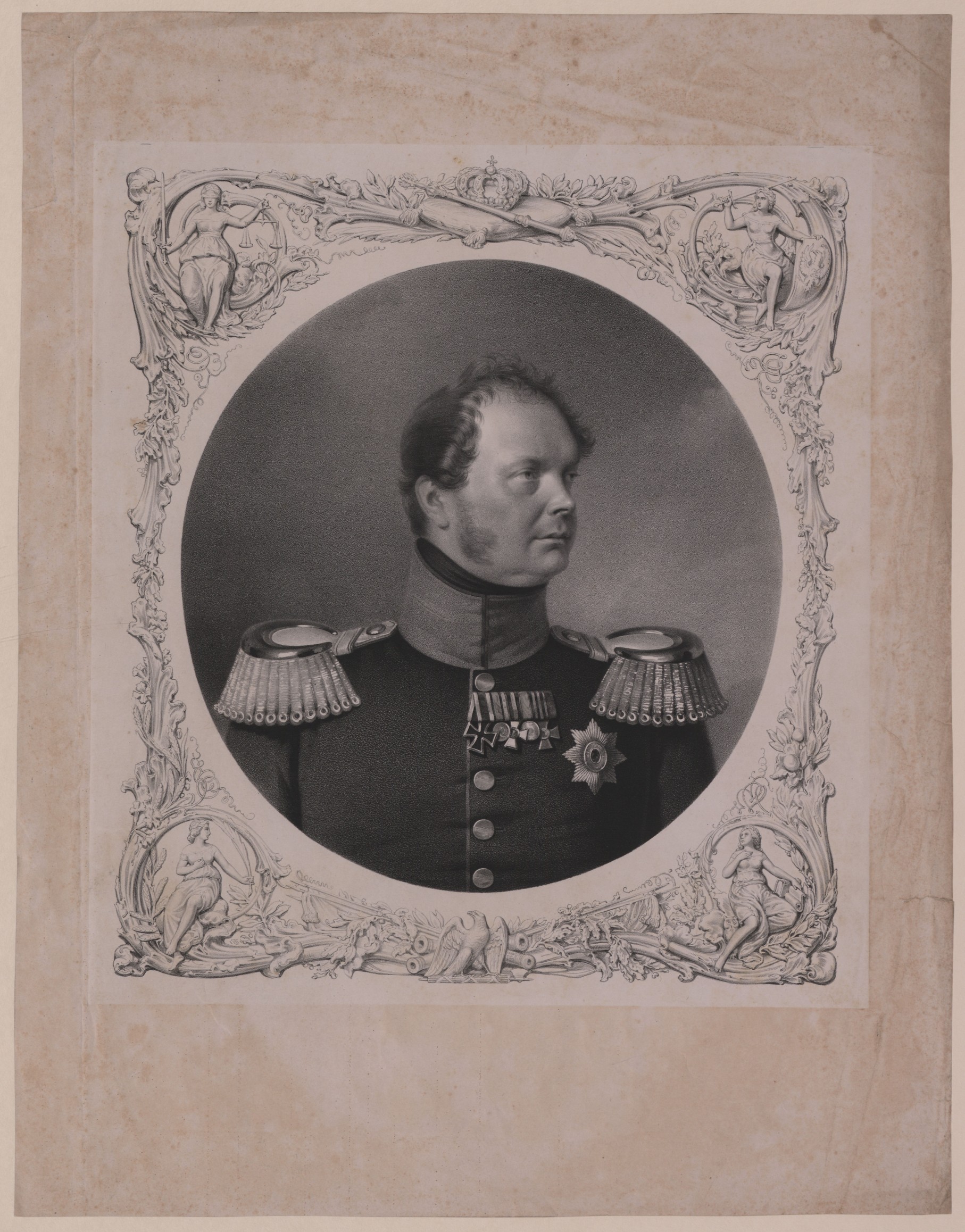 Kreidelithographie; 30 x 28,6 cm (Portrait, oval) bzw. ca. 39,5 x 34,5 cm (Rahmen). - Im Rahmen stockfleckig, darüber hinaus auch gebräunt, faltig und mit Einrissen am Blattrand. - MIT DIGITALAUFNAHME