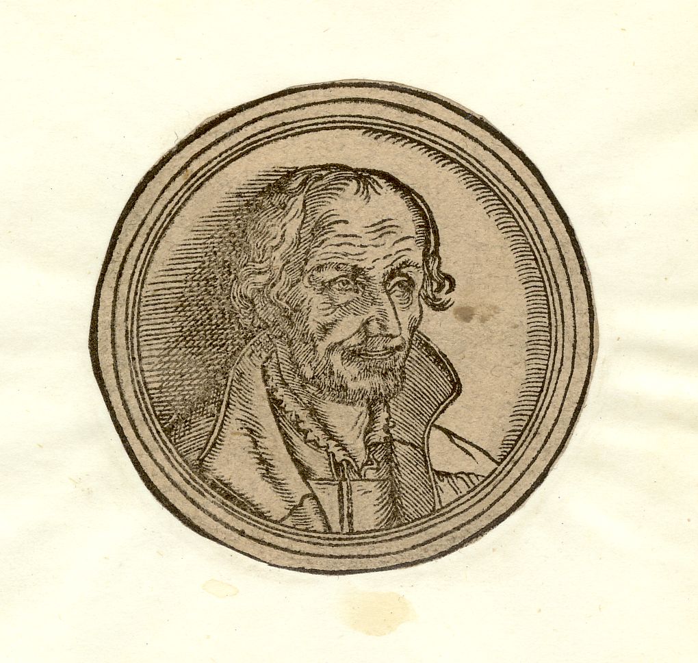 Holzschnitt; 5 x 5,1 cm (im Medaillon) bzw. 6 x 6,2 cm (gesamt). - Ringsum beschnitten, auf Papier aufgeklebt, gebräunt. - MIT DIGITALAUFNAHME