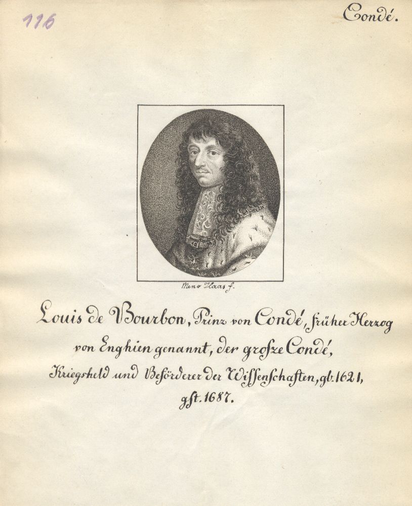 früher Herzog von Enghien genannt, der grosze Condé, Kriegsheld und Beförderer der Wissenschaften, gb. 1621, gst. 1687 [!] ; [Brustbild nach links]