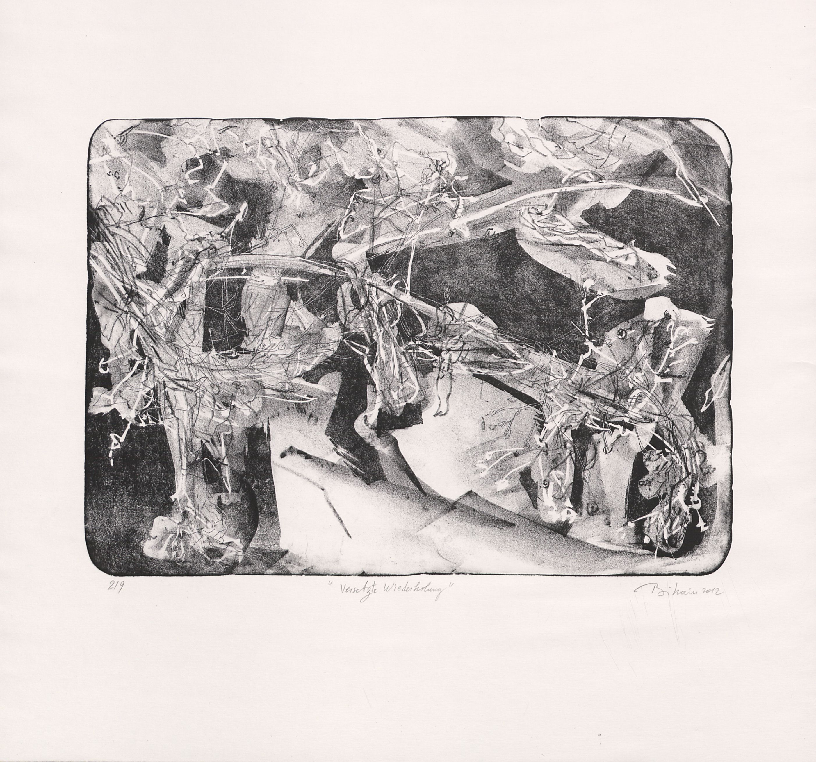 Kreidelithographie mit Feder, Tusche, Gravur und Gummischablone; ca. 26,7 x 37,6 cm (Bild) bzw. 45 x 48 cm (Blatt). - Vom Künstler mit Bleistift bezeichnet, datiert, numeriert (2/9) und signiert. - Am rechten Rand zwei Falten. - MIT DIGITALAUFNAHME