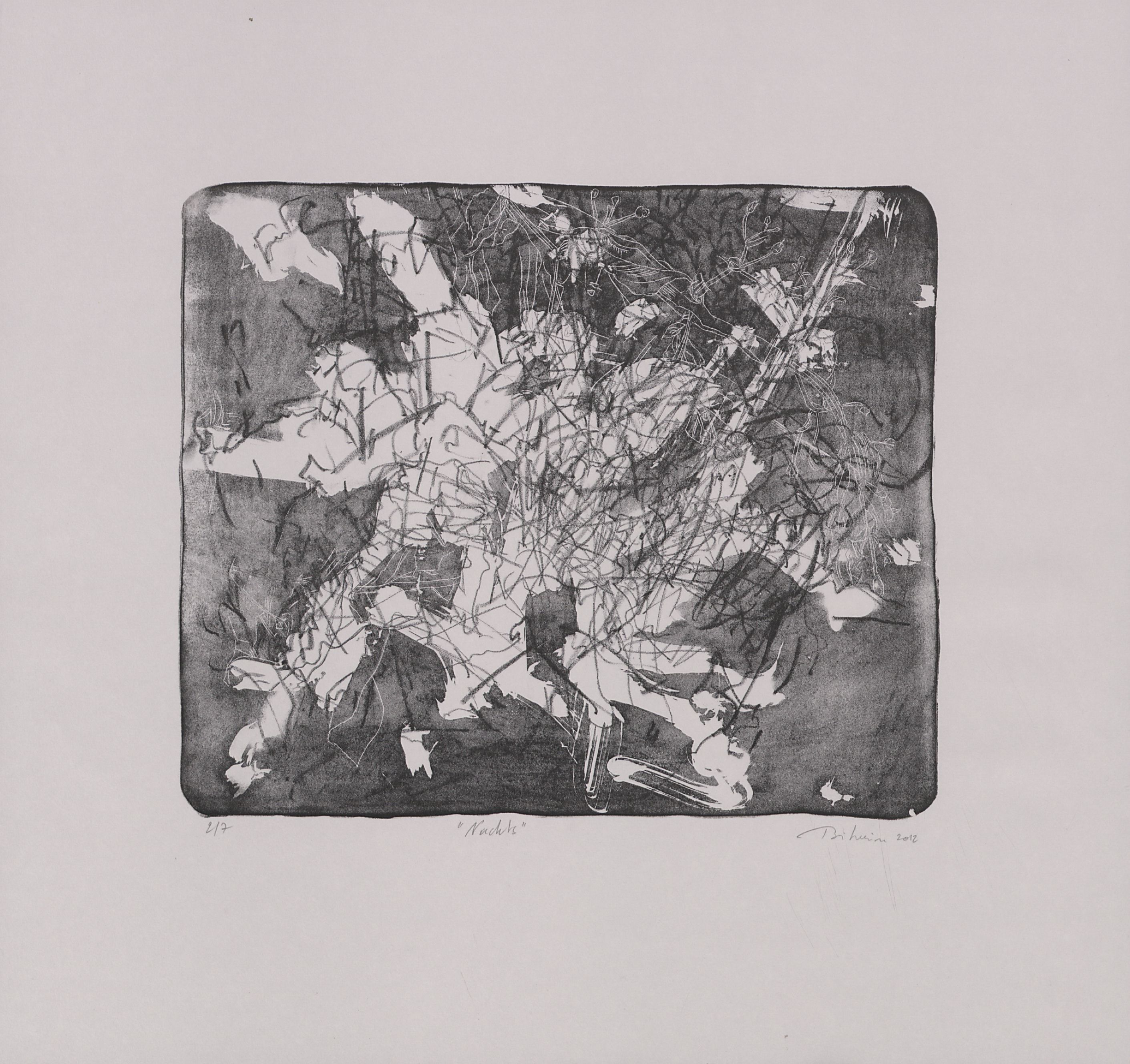 Kreidelithographie mit Gravur und Gummischablone; ca. 26,7 x 32 cm (Bild) bzw. 45,5 x 48,2 cm (Blatt). - Vom Künstler mit Bleistift bezeichnet, datiert, numeriert (2/7) und signiert. - MIT DIGITALAUFNAHME