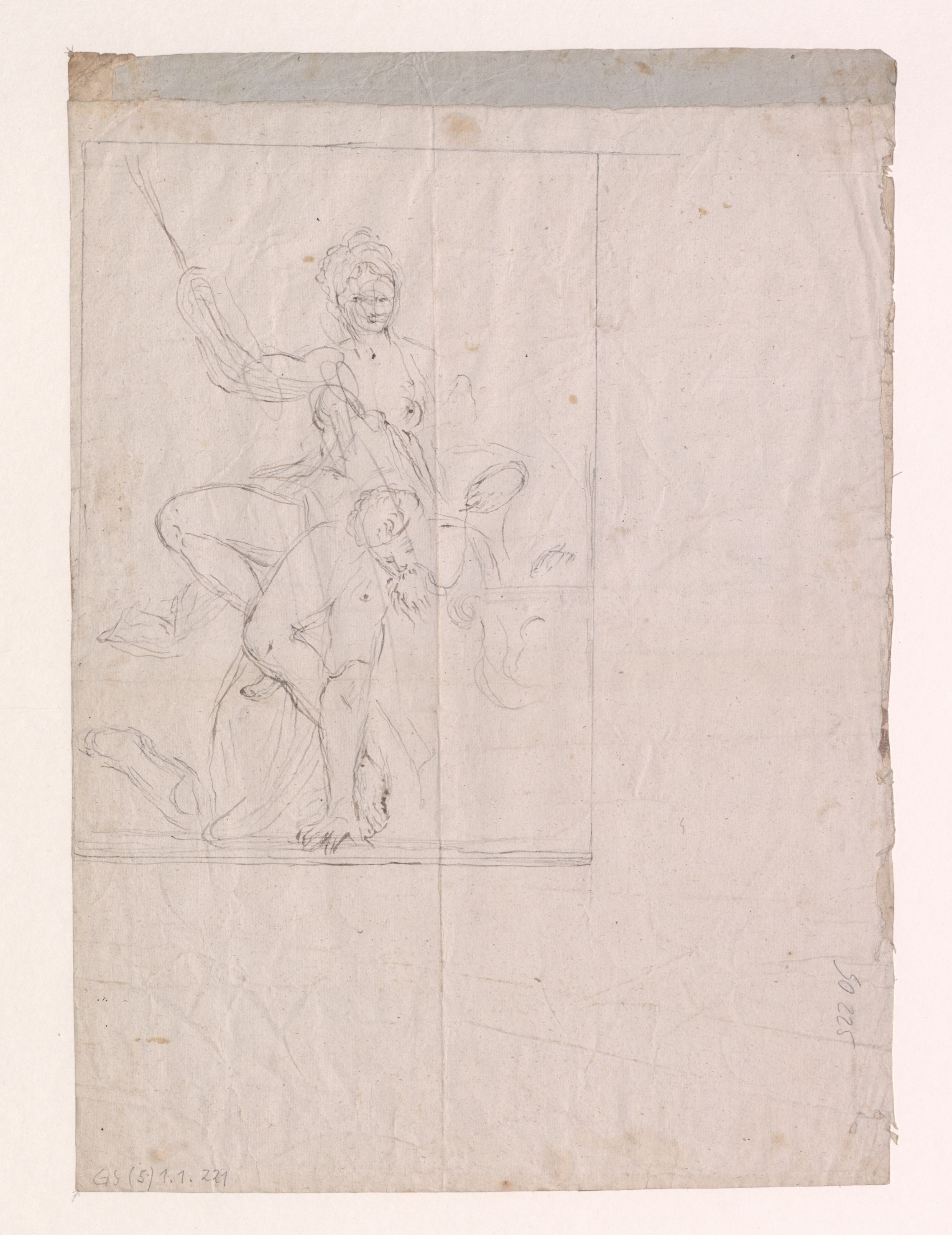 Bleistift und Feder in braun; 29,1 x 20,9 cm (Rahmen) bzw. 44 x 33,2 cm (Blatt). - Etwa in der Mitte senkrecht gefalzt, zahlreiche weitere Falten, Flecken, am rechten Blattrand beschädigt. - Auf die Rückseite eines etwas größeren Stiches aufgeklebt. - MIT DIGITALAUFNAHME