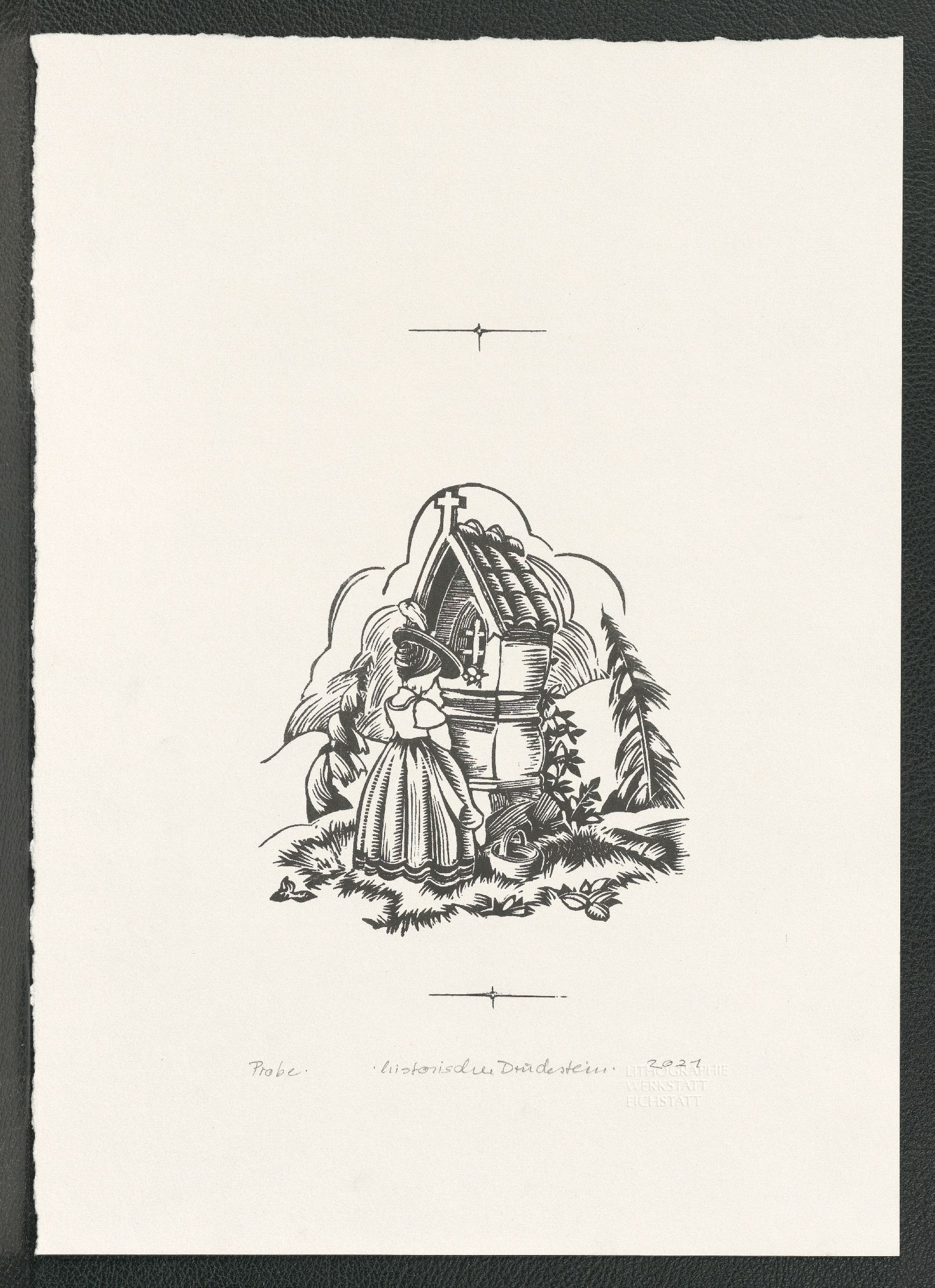 [Mädchen vor kleiner Wegkapelle, im Stil eines Holzschnittes]