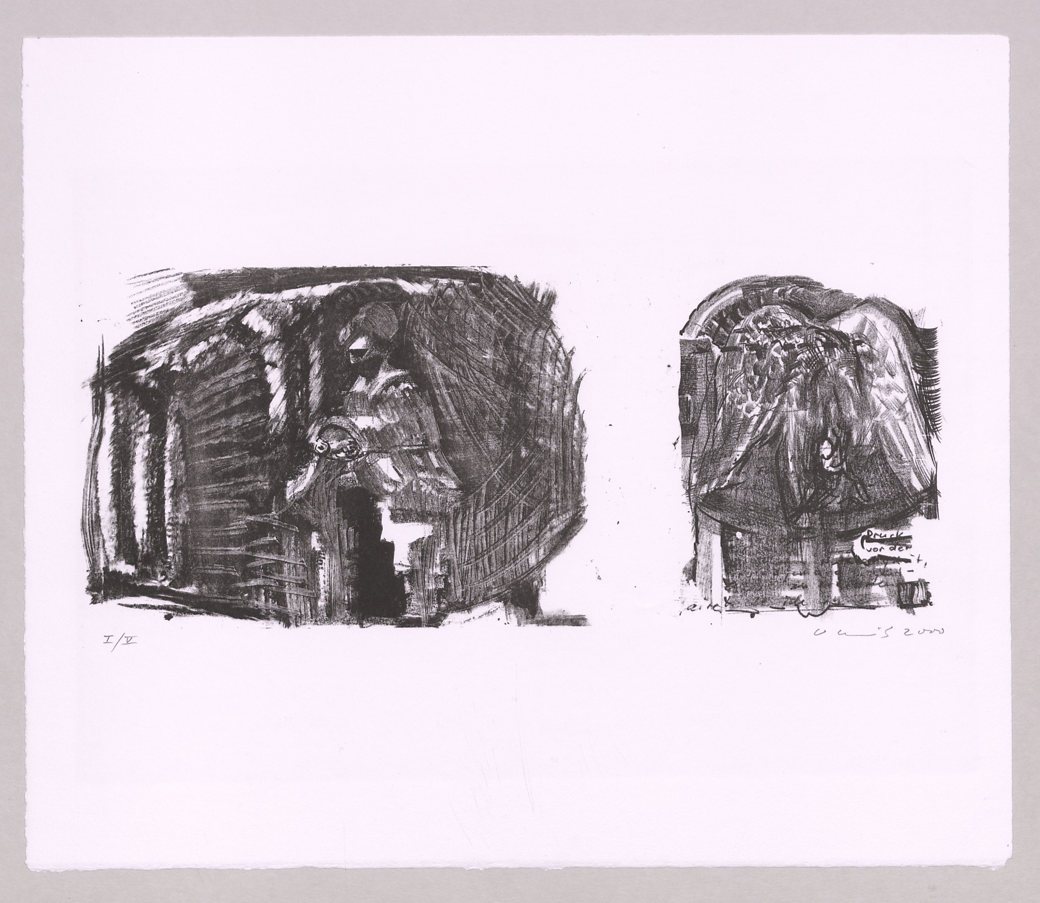 Lithographie (2 Ansichten, gedruckt von einem Stein); ca. 20 x 47 cm (Ansichten zusammen) bzw. 44,8 x 53 cm (Blattgröße). - Mit Bleistift datiert, numeriert (I/V) und signiert. - Gedruckt auf Büttenpapier. - MIT DIGITALAUFNAHME