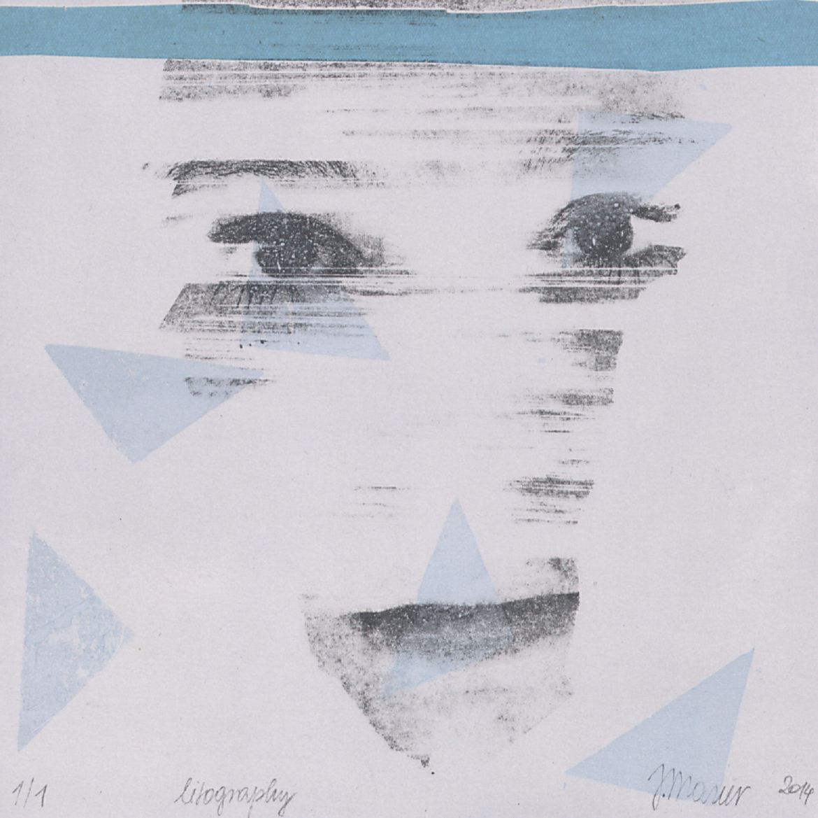 [Teil eines Gesichts, zusammen mit mehreren Dreiecken und einem Papierstreifen]