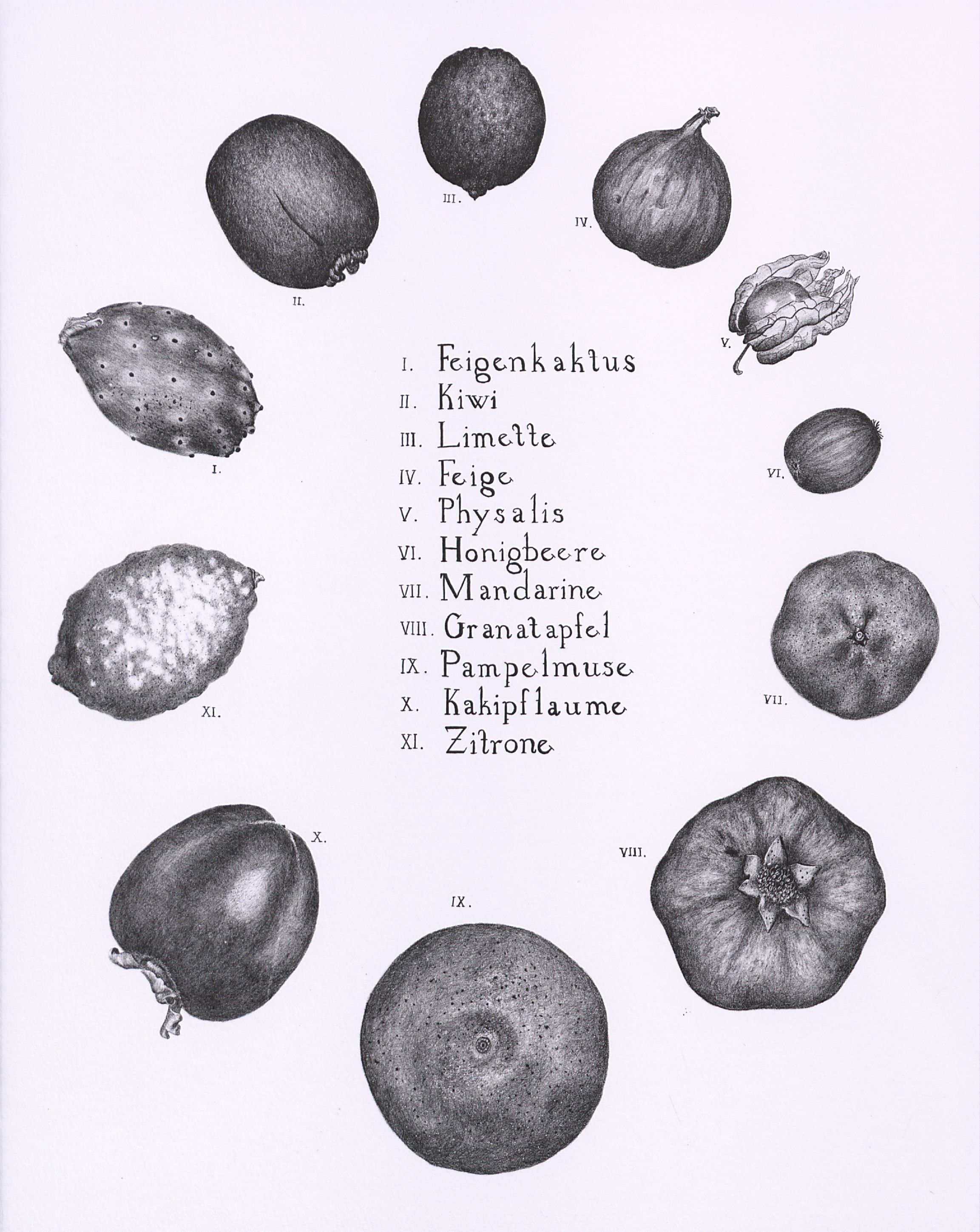 [Abbildung folgender Früchte, im Stil des Hortus Eystettensis:] I. Feigenkaktus II. Kiwi III. Limette IV. Feige V. Physalis VI. Honigbeere VII. Mandarine VIII. Granatapfel IX. Pampelmuse X. Kakipflaume XI. Zitrone