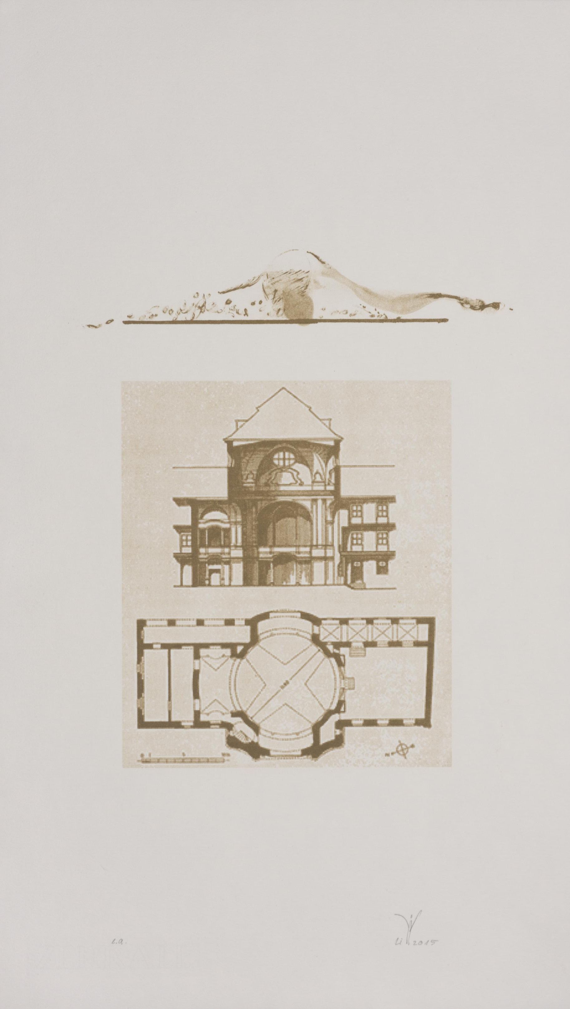 Lithographie (computerbearbeiteter Grundriß und Längsschnitt, Zierleiste lithographisch); ca. 28 x 24 cm (Bild mit Zierleiste) bzw. 55,3 x 31,8 cm (Blatt). - Von der Künstlerin mit Bleistift datiert und signiert. - MIT DIGITALAUFNAHME
