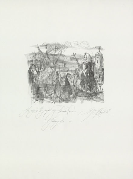 Kreidelithographie; ca. 22 x 28,5 cm (Bild) bzw. 63,5 x 48 cm (Blatt). - Vom Künstler mit Bleistift bezeichnet, datiert und signiert. - MIT DIGITALAUFNAHME