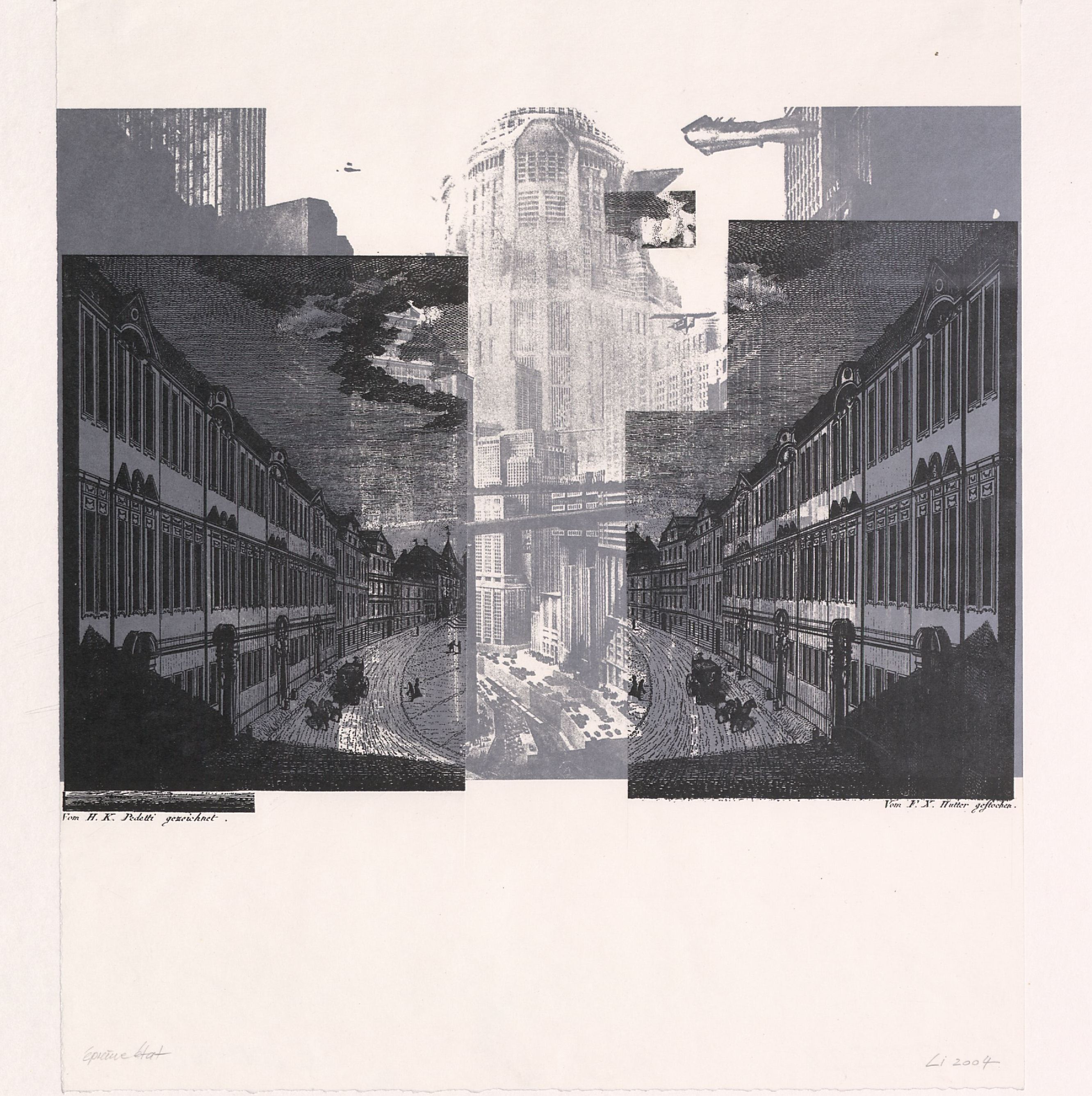 [Stadtansicht aus Fritz Langs Film "Metropolis" , darüber gedruckt ein vergrößerter Nachdruck der rechten Seite und dessen Spiegelbild einer Ansicht des Eichstätter Residenzplatzes von 1791] ; [entstanden anläßlich des Projekts "Stadt - Film - Bilder" des Kultur-Forums Eichstätt vom 26.-31.07.2004]