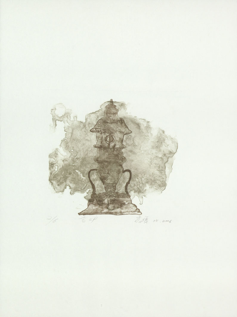 Lithographie (Tusche, Kreide - 2 Farben); ca. 23 x 26 cm (Bild) bzw. 64 x 48 cm (Blatt). - Vom Künstler mit Bleistift bezeichnet, datiert, numeriert (2/6) und signiert. - Titel und Künstlerangabe auf der Vorderseite in chinesischen Schriftzeichen, Titel auf der Rückseite auf deutsch wiederholt. - MIT DIGITALAUFNAHME