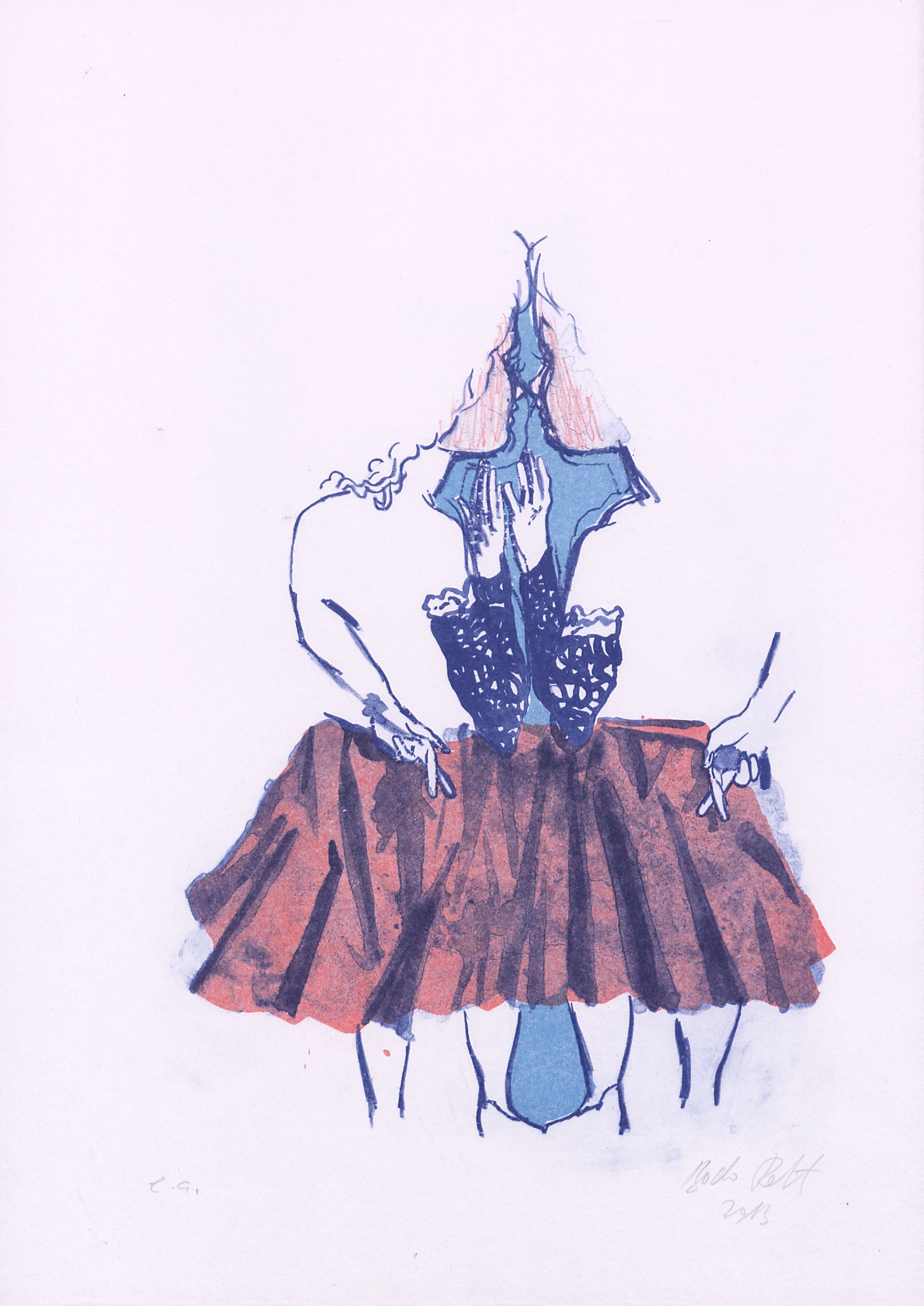 Lithographie (Kreide, Tusche; 3 Farben); ca. 38,2 x 26,9 cm (Bild) bzw. 53,9 x 38,2 cm (Blatt). - Links oben und rechts unten je ein kleines Loch im Papier (außerhalb des Bildes). - Vom Künstler mit Bleistift bezeichnet (auf der Rückseite), datiert und signiert. - MIT DIGITALAUFNAHME