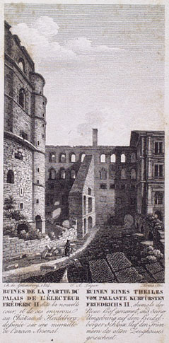 Ruines de la partie du palais de l'électeur Frédéric II dite la nouvelle cour, et de ses environs au Château de Heidelberg = Ruinen eines Theiles vom Pallaste (!) Kurfürsten Friedrichs II, ehemals der Neue Hof genannt, und seiner Umgebung auf dem Heidelberger Schlosse