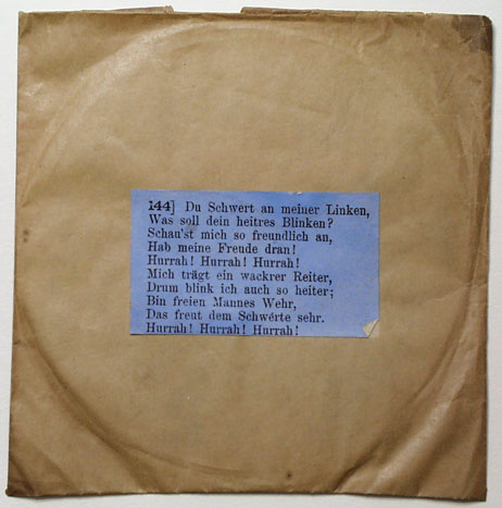 «Kat.-Nr. 244 (handschriftl. eingraviert: N° 144). - Alle Copir-Rechte vorbehalten. - D.R.P. 45048. - Anm.: Sachtitel u. Zusatz zum Sachtitel handschriftl. eingraviert. Die unbespielte Plattenrückseite u. d. Umschlaghülle enthalten je ein Papierettikett mit d. gesungenen Text: 144] Du Schwert an meiner Linken, || Was soll dein heitres Blinken? || Schau'st mich so freundlich an, || Hab meine Freude dran! || Hurrah! Hurrah! Hurrah! || Mich trägt ein wackrer Reiter, || Drum blink ich auch so heiter;...