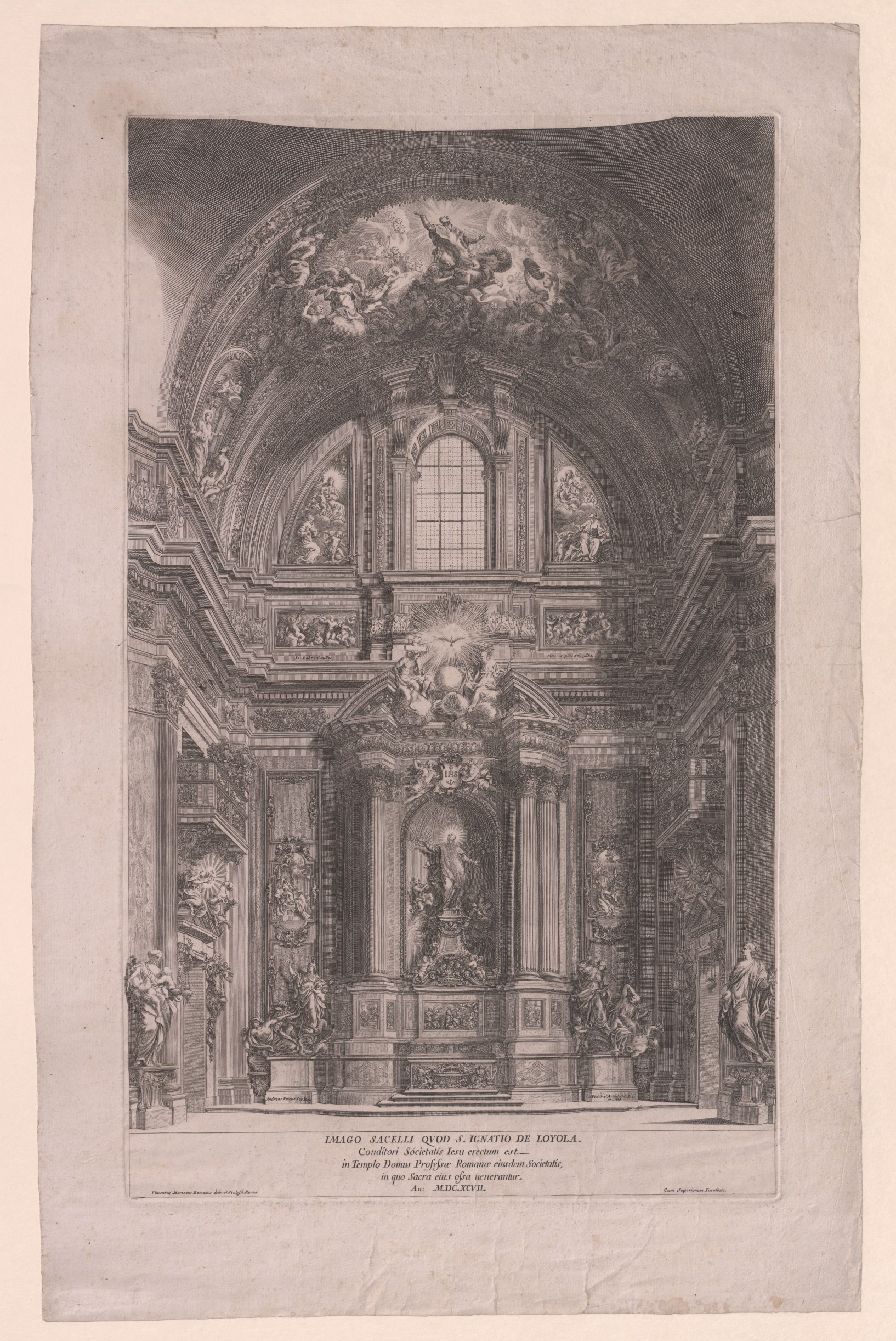 Vincentius Mariottus Romanus delin. et sculpsit Romae Cum Superiorum Facultate ; [Für die Originalfresken:] Io. Babt. Gaullus Inv. et pin. An. 1685 ; [Für den Altar:] Andreas Puteus Soc. Iesu Pictor, et Architectus Inv. an. 1697