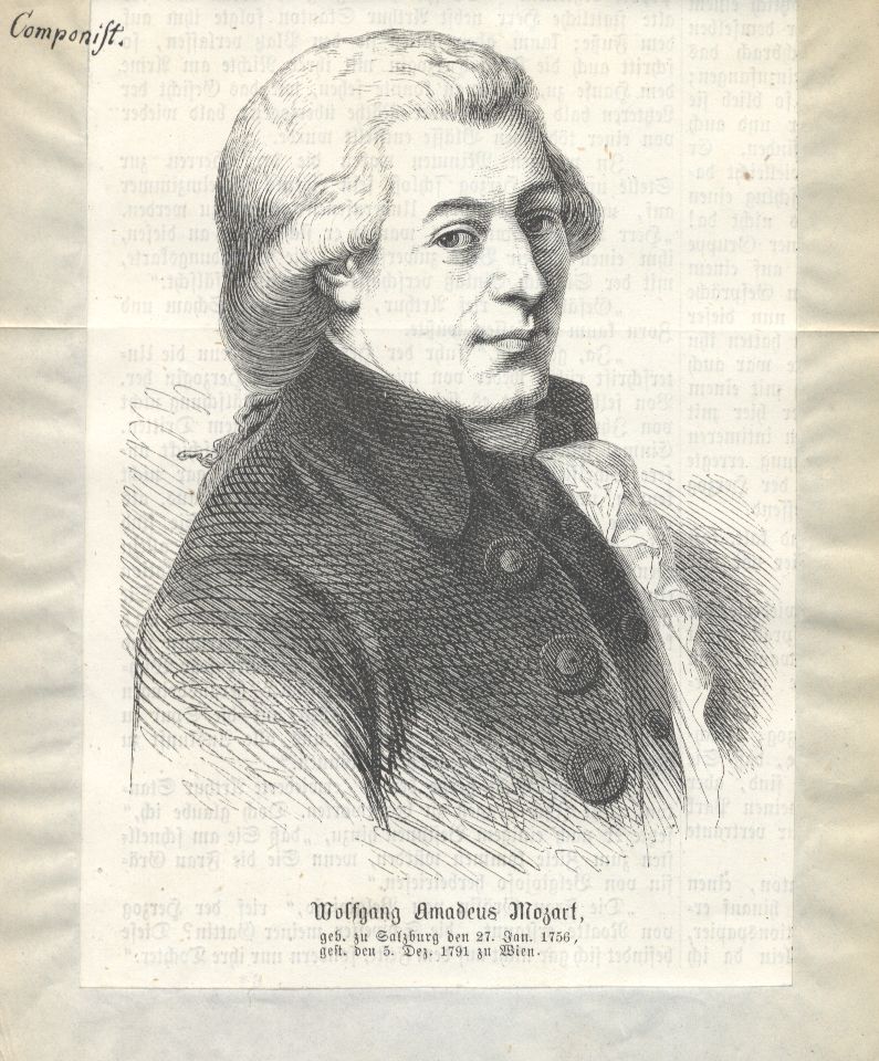 geb. zu Salzburg den 27. Jan. 1756, gest. den 5. Dez. 1791 zu Wien ; [Brustbild im Profil nach rechts, Kopf in Richtung des Betrachters gewandt]