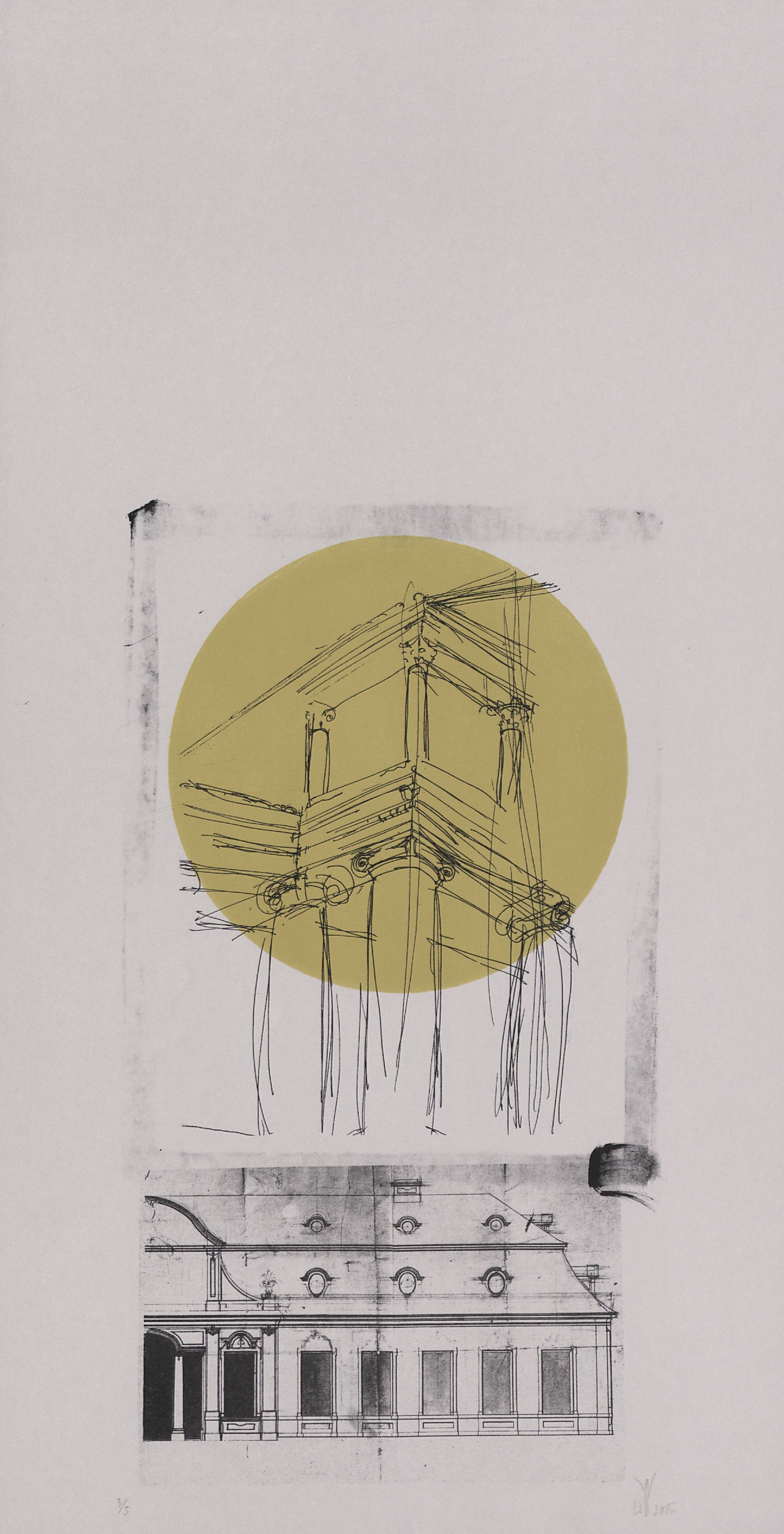[Architekturzeichnung von Li Portenlänger aus der Gegend um Vicenza über einem ockerfarbenem Kreis, darunter Teil eines Entwurfs der nicht verwirklichten Orangerie Schloß Zöbingen von Gabriel de Gabrieli]
