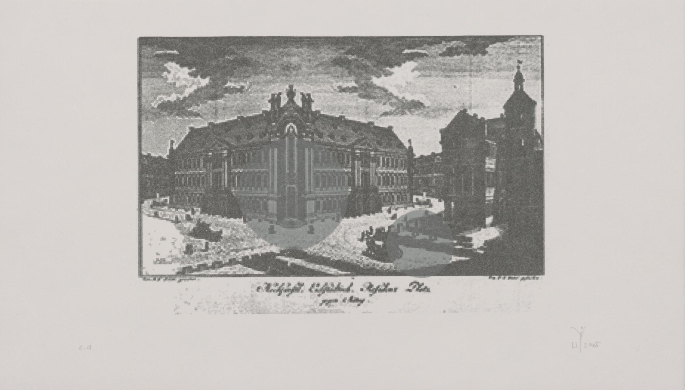 Lithographie (computerbearbeitete Ansicht, Seifenfeld, Gravur); 15,1 x 22,2 cm (Bild) bzw. 22 x 37,9 cm (Blatt). - Von der Künstlerin mit Bleistift datiert und signiert. - MIT DIGITALAUFNAHME