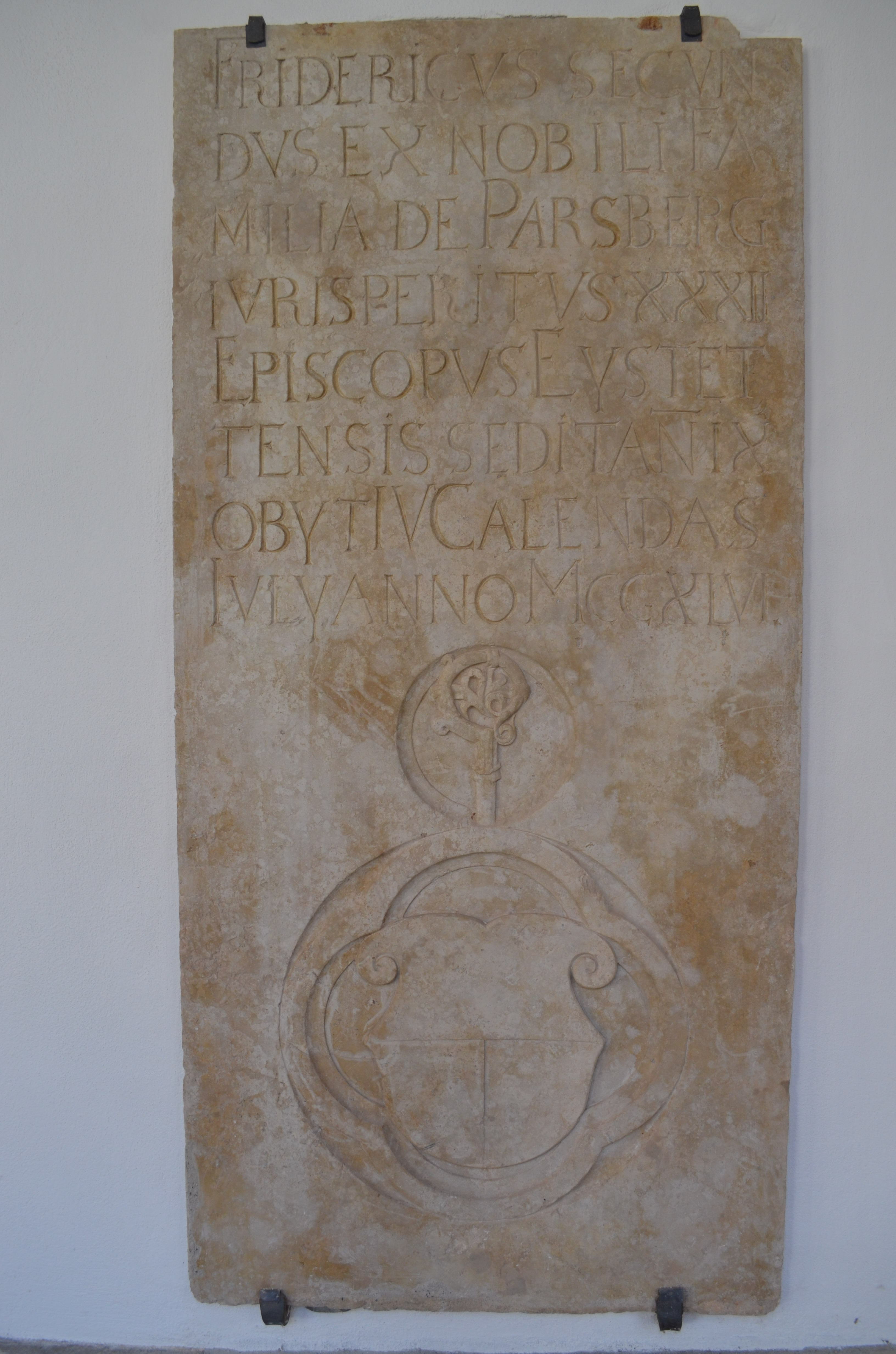 Fridericus secun- / dus ex nobili Fa- / milia de Parsberg / iurisperitus XXXII Episcopus Eystet- /tensis seditan IX (?) / obyt IV Calendas / Iuly anno MCCXLVI.