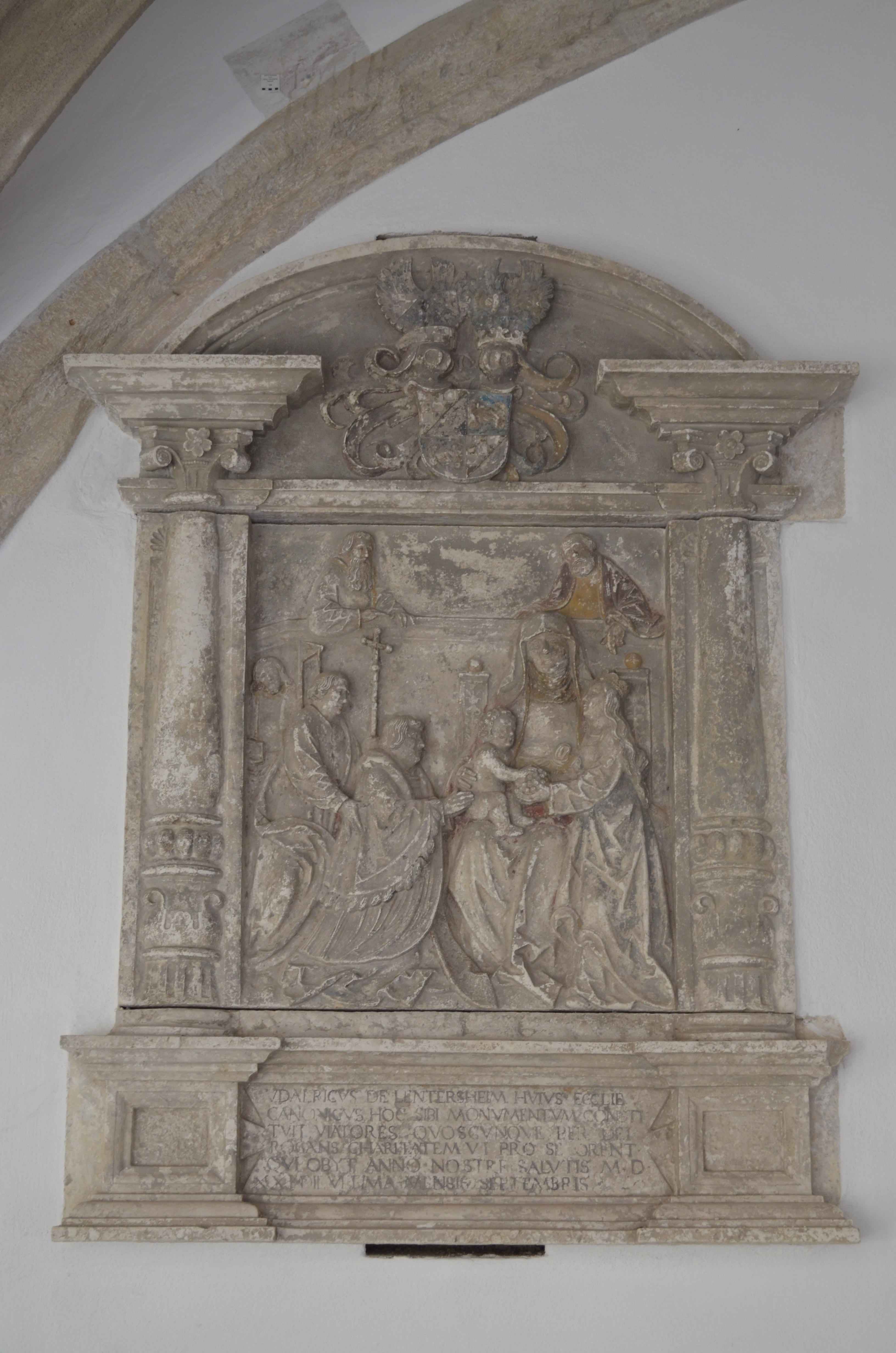 ULDARICUS DE LENTERSHEIM HUIUS ECCLESIÆ CANONICUS HOC SIBI MONUMENTUM CONSTITUIT VIATORES QUOSCUNQUE PER DEI ... CHARITATEM VI PRO SE ORENT QUI OBYT ANNO NOSTRI SALUTIS MDXXI DIE VI ... MENSIS SEPTEMBRIS.