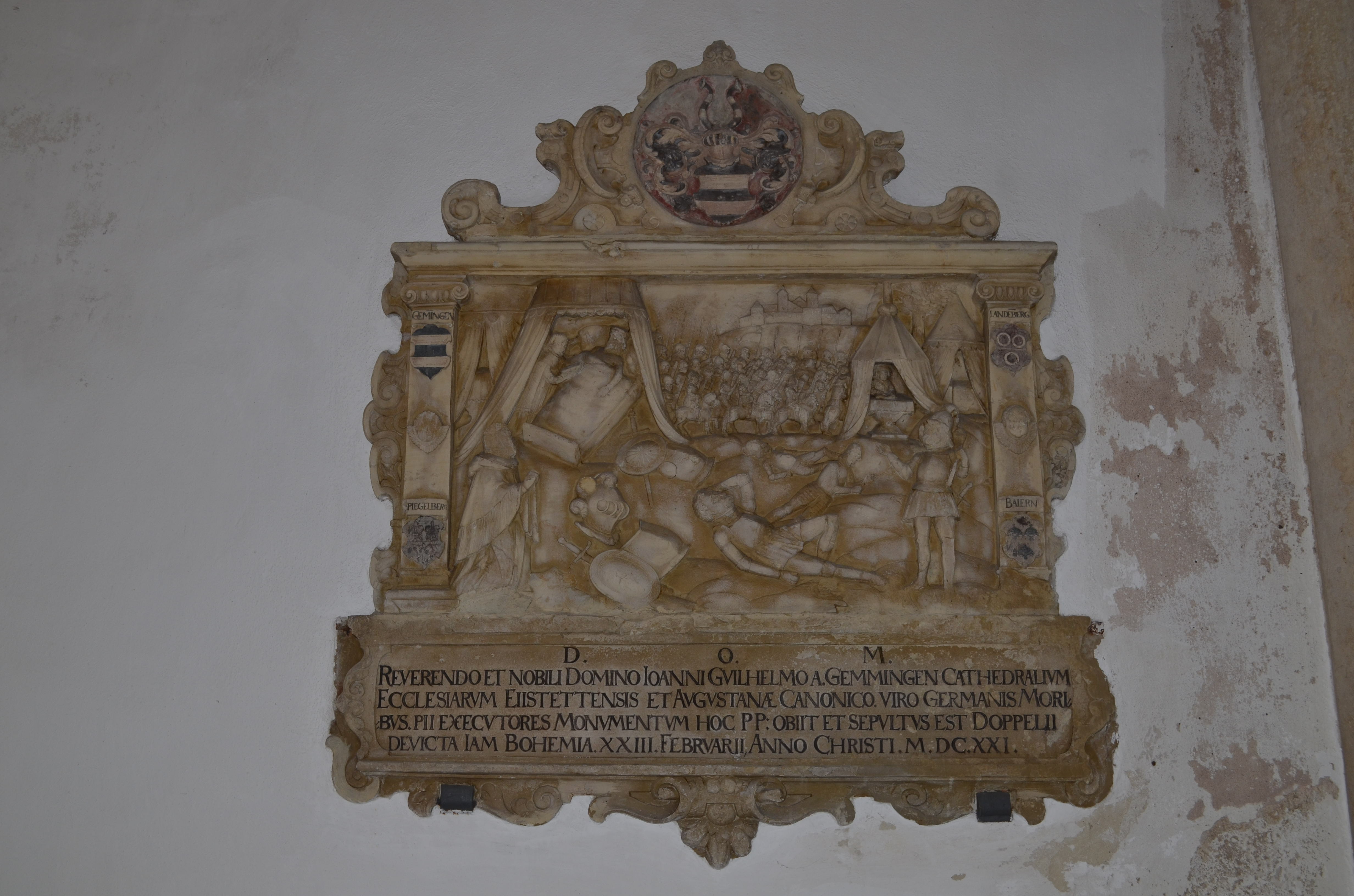 D.O.M. / REVERENDO ET NOBILI DOMINO IOANNI GUILHELMO A. GEMMINGEN CATHEDRALUM / ECCLESIARUM EIISTETTENSIS ET AUGUSTIANÆ CANONICO. VIRO GERMANIS MORI- / BUS. PII EXECUTORES MONUMENTUM HOC PP: OBIIT ET SEPULTUS EST DOPPELII / DEVICTA IAM BOHEMIA. XXIII. FEBRUARII ANNO CHRISTI.M.DC.XXI.