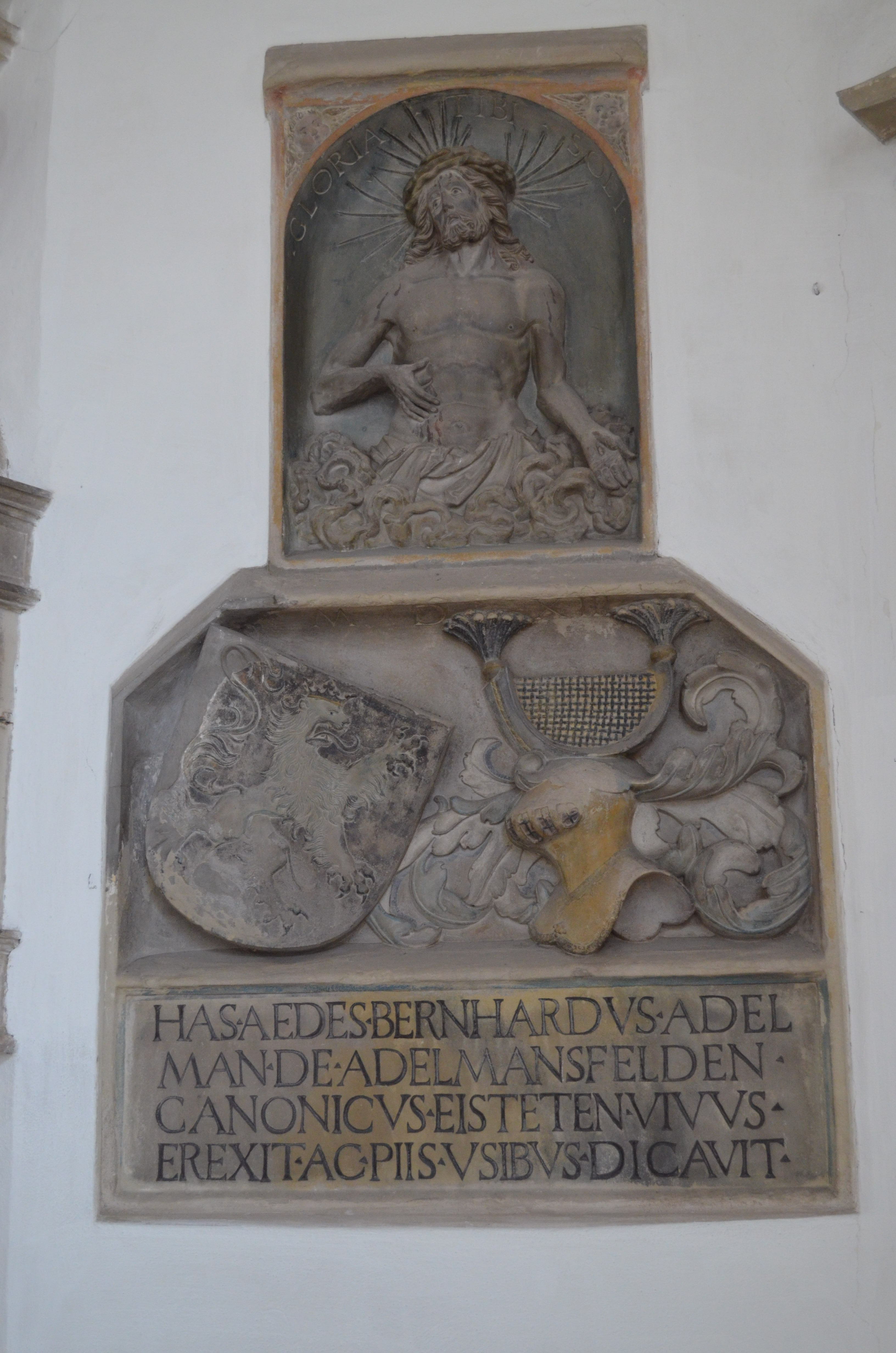 HAS AEDES BERNHARDUS ADEL / MAN DE ADELMANSFELDEN / CANONICUS EISTETEN VIVUS / EREXIT AC PIIS USIBUS DICAVIT