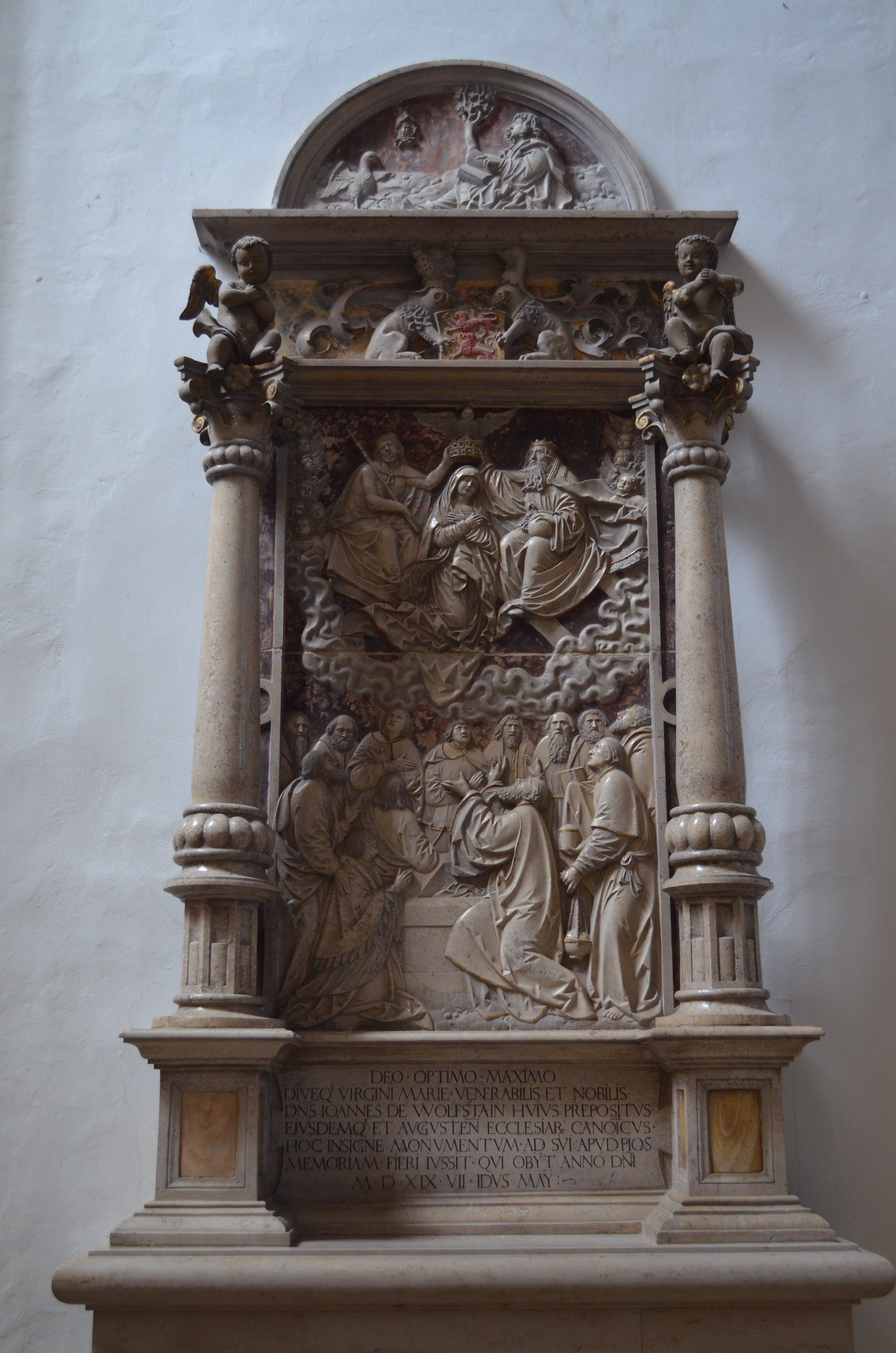 DEO OPTIMO MAXIMO / DIVEQE VIRGINE MARIE VENERABILIS ET NOBILIS / DNS IOANNES DE WOLFSTAIN HUIUS PREPOSITUS / EIUSDEMQE ET AUGUSTEN ECCLESIAR CANOICUS / HOC INSIGNE MONUMENTUM AD SUI APUD PIOS / MEMORIAM FIERI IUSSIT QUI OBYT ANNO DNI / M.D.XIX.VII. IDUS MAY:
