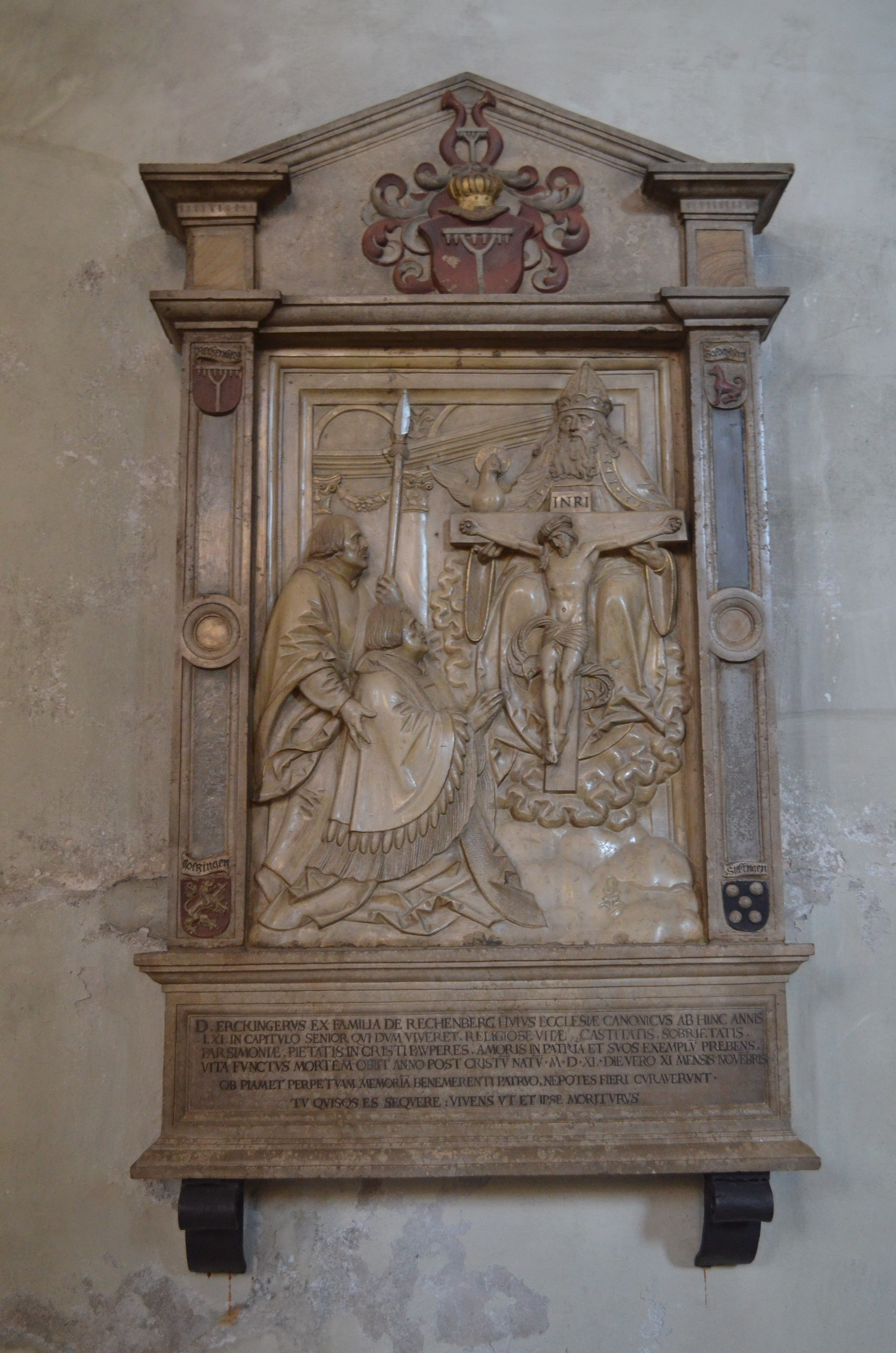 in einer Art Ädikula abgebildete Szene; darunter Inschrift, im Giebel Wappen der Rechenberg