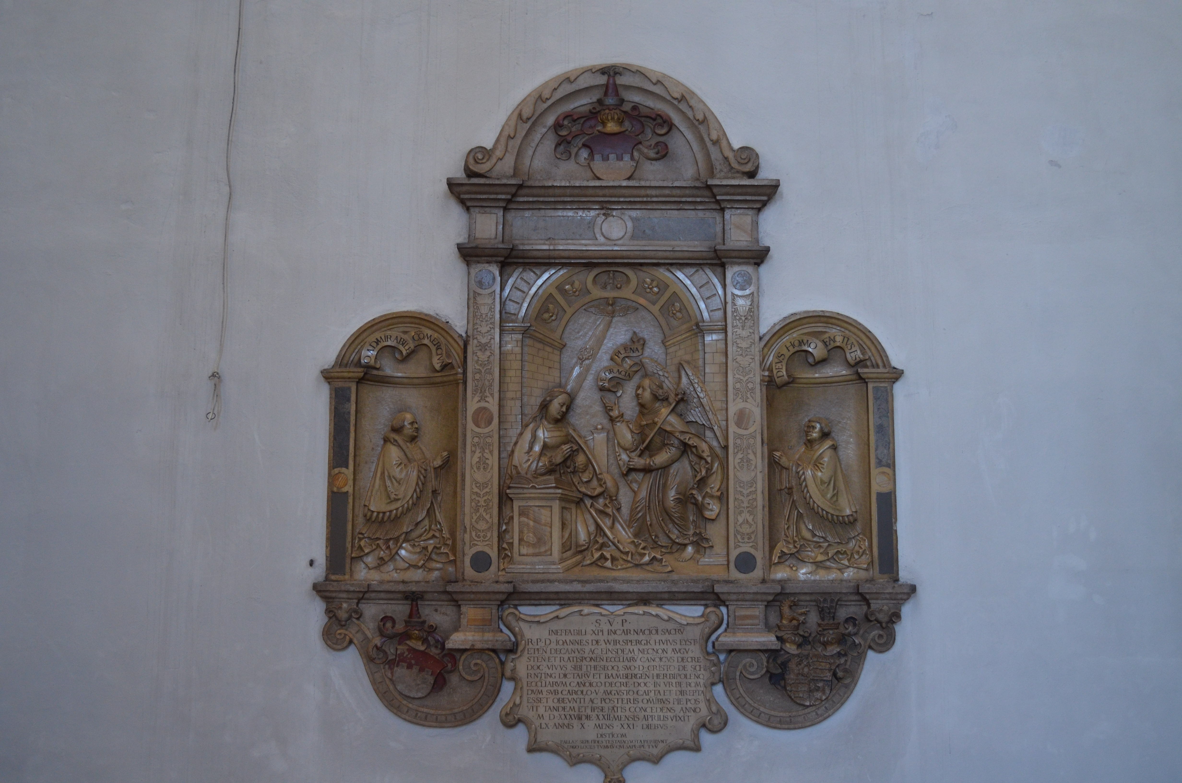 INEFFABILI XPI INCARNACIOI SACRU / R P D IOANNES DE WIRSPERGK HUIUS EIST- / ETEN DECANUS AC EINSDEM NECNON AUGU- / STEN ET RATISPONEN EXXLIARU CANOICUS DECRE / DOC VIVUS SIBI THESEOQ . SUO D CRISTO DE SCHI- / RNTING DICTARU ET BAMBERGEN HERBIPOLENQ / ECCLIARUM CANOICO DECRE DOC IN URBE ROMA / DUM SUB CAROLO V AUGUSTO CAPTA ET DIREPTA / ESSET OBEUNTI AC POSTERIS OMNIBUS PIE POS- / UIT TANDEM ET IPSE FATIS CONCEDENS ANNO / M D XXXVII DIE XXII MENSIS APRILIS VIXIT / LX ANNIS X MENS XXI DIEBUS / DISTICOM /