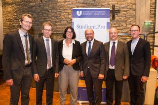 (v.l.) Prof. Dr. Martin Kirschner und Prof. Dr. Ulrich Kropac (beide Arbeitskreis Forum K'Universale), KU-Präsidentin Prof. Dr. Gabriele Gien, Martin Schulz, Prof. Dr. Richard Nate und Michael Winklmann (Arbeitskreis Forum K'Universale). (Fotos: Klenk/upd)