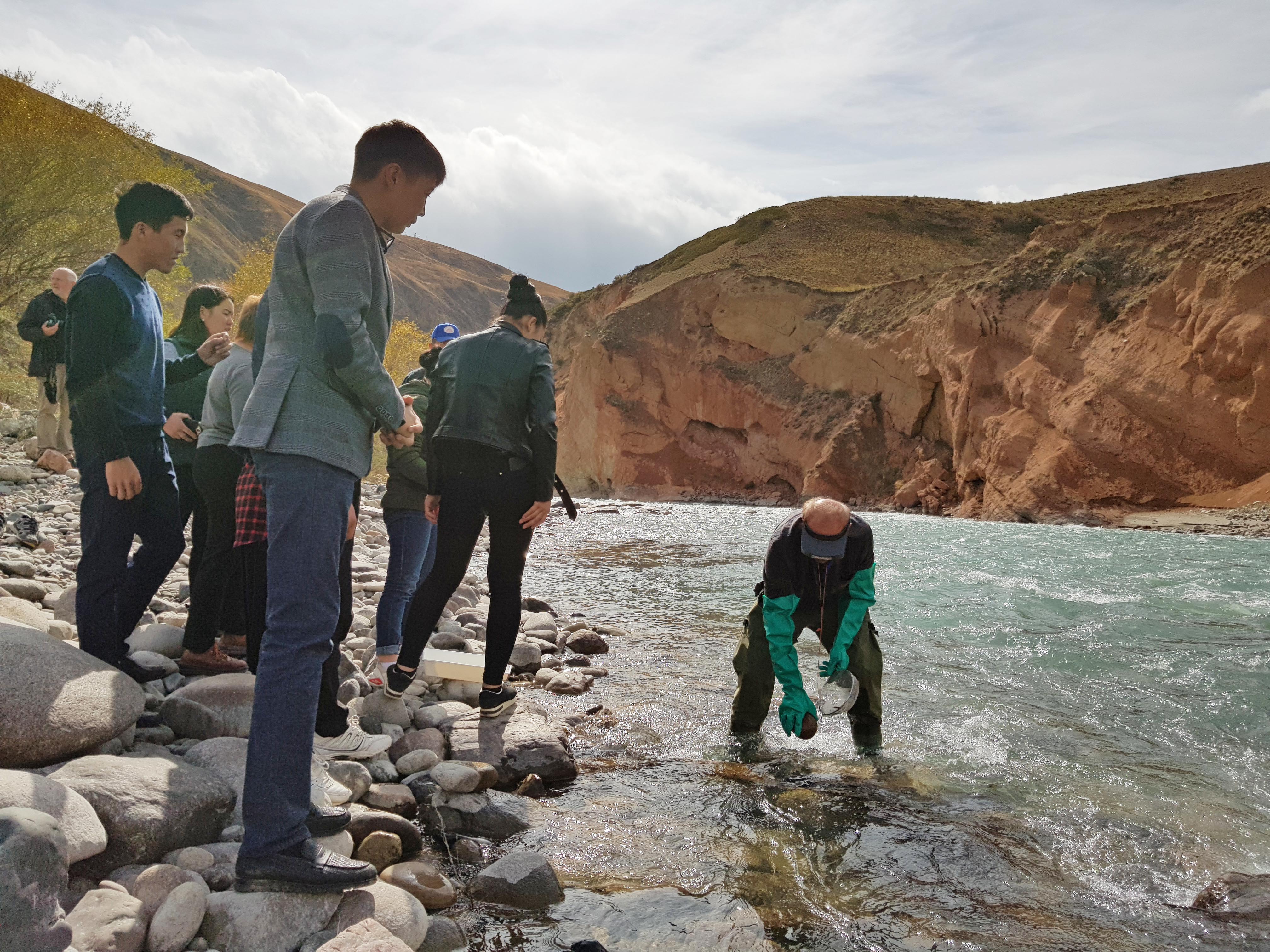 Honorarprofessor Dr. Benno Kügel von der KU bei einer Probenentnahme im Fluss Naryn. (Foto: Betz/upd)