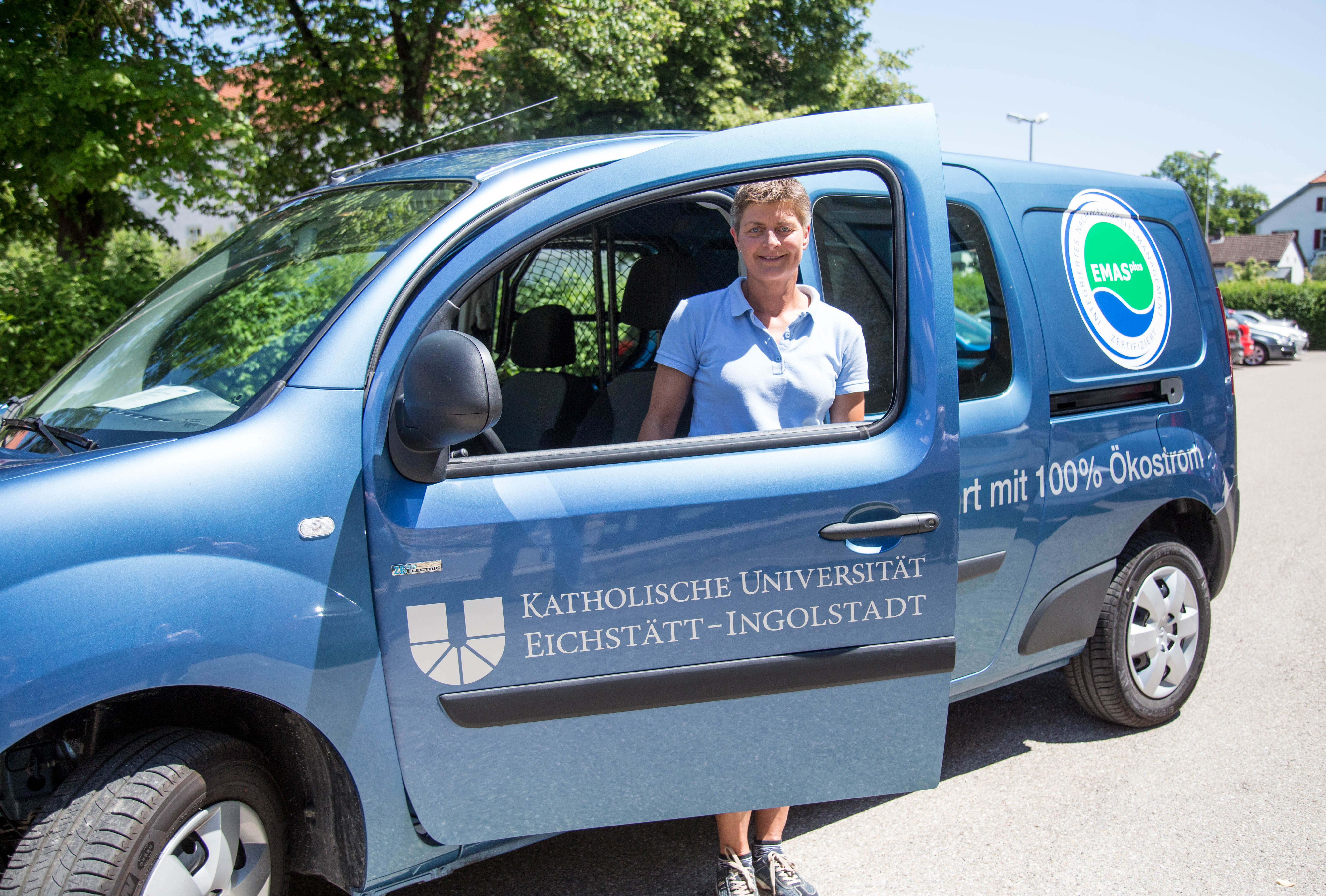 Rosmarie Regler, Mitarbeiterin der Poststelle der KU, mit dem neuen elektrischen Postauto. (Foto: Klenk/upd)