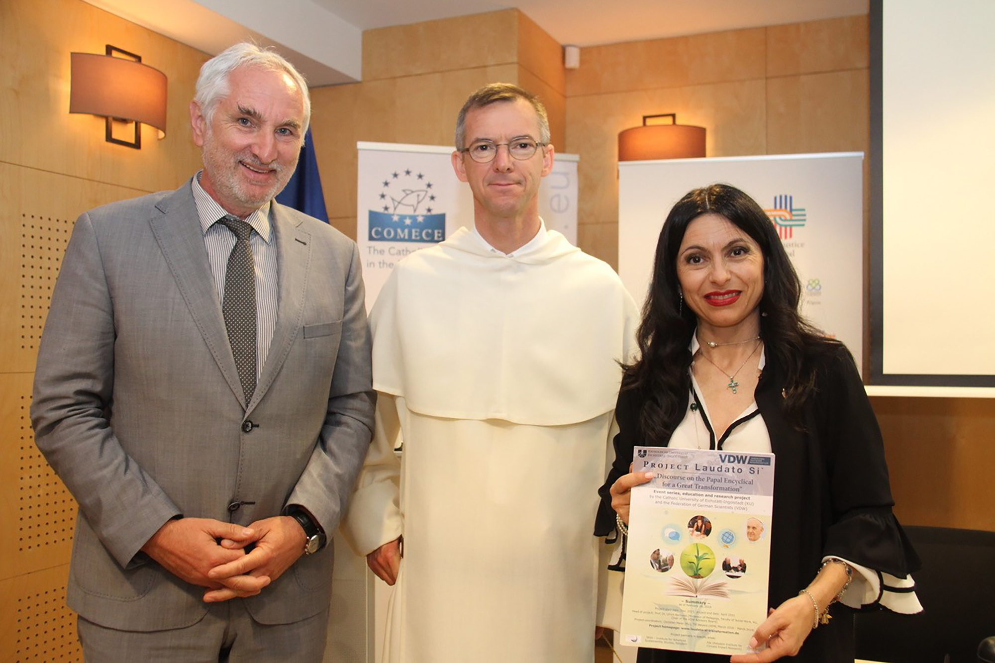 (v.l.) Prof. Dr. Ulrich Bartosch gemeinsam mit Frater Olivier Poquillon OP (Generalsekretär der COMECE), Prof. Dr. Stefania Proietti (Bürgermeisterin von Assisi). (Foto: upd)