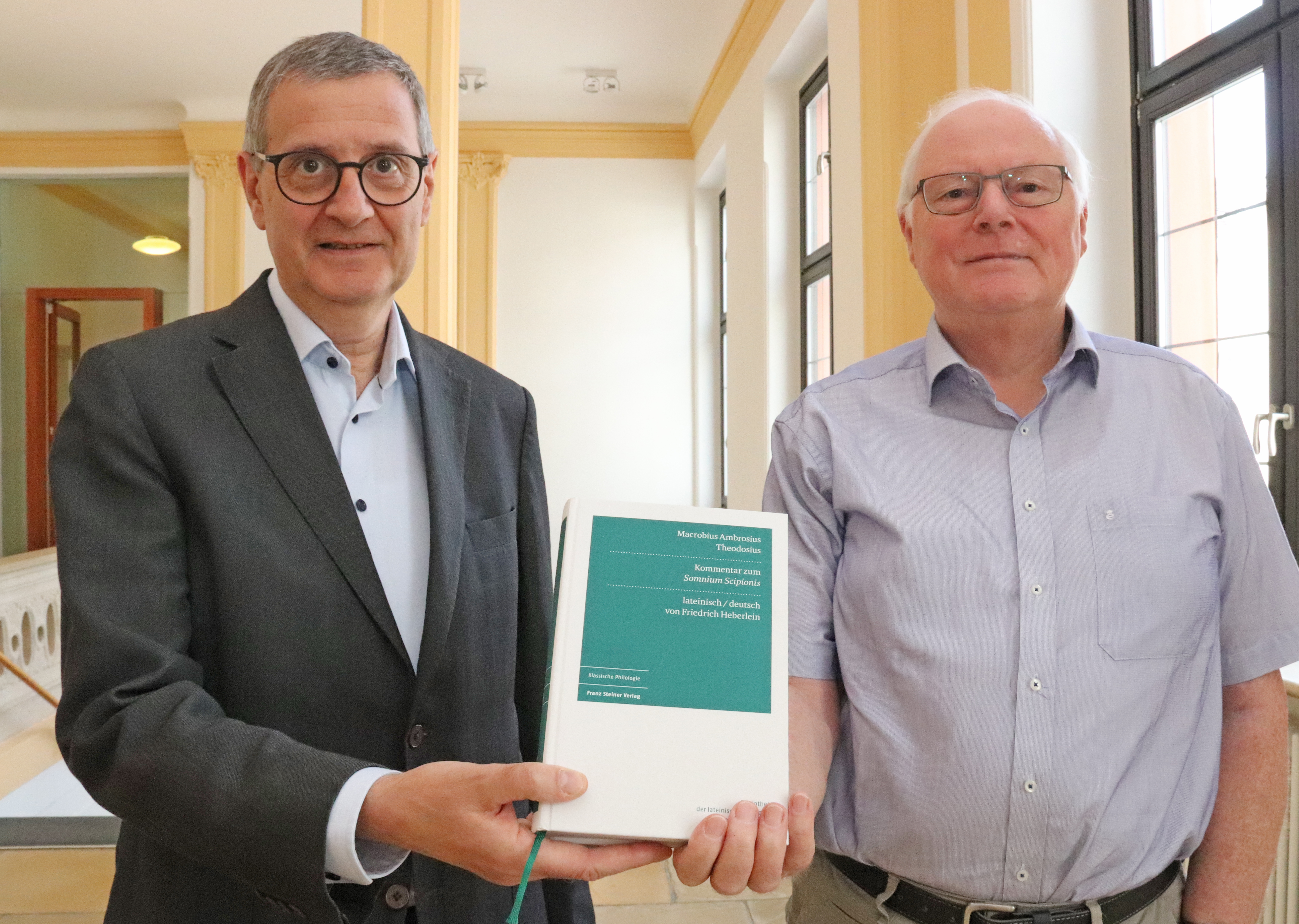 (v.l.) Prof. Dr. Bardo Maria Gauly und Prof. Dr. Friedrich Heberlein präsentieren den ersten Band der neuen Reihe „Bibliothek der lateinischen Literatur der Spätantike“. (Foto: Schulte Strathaus/upd)