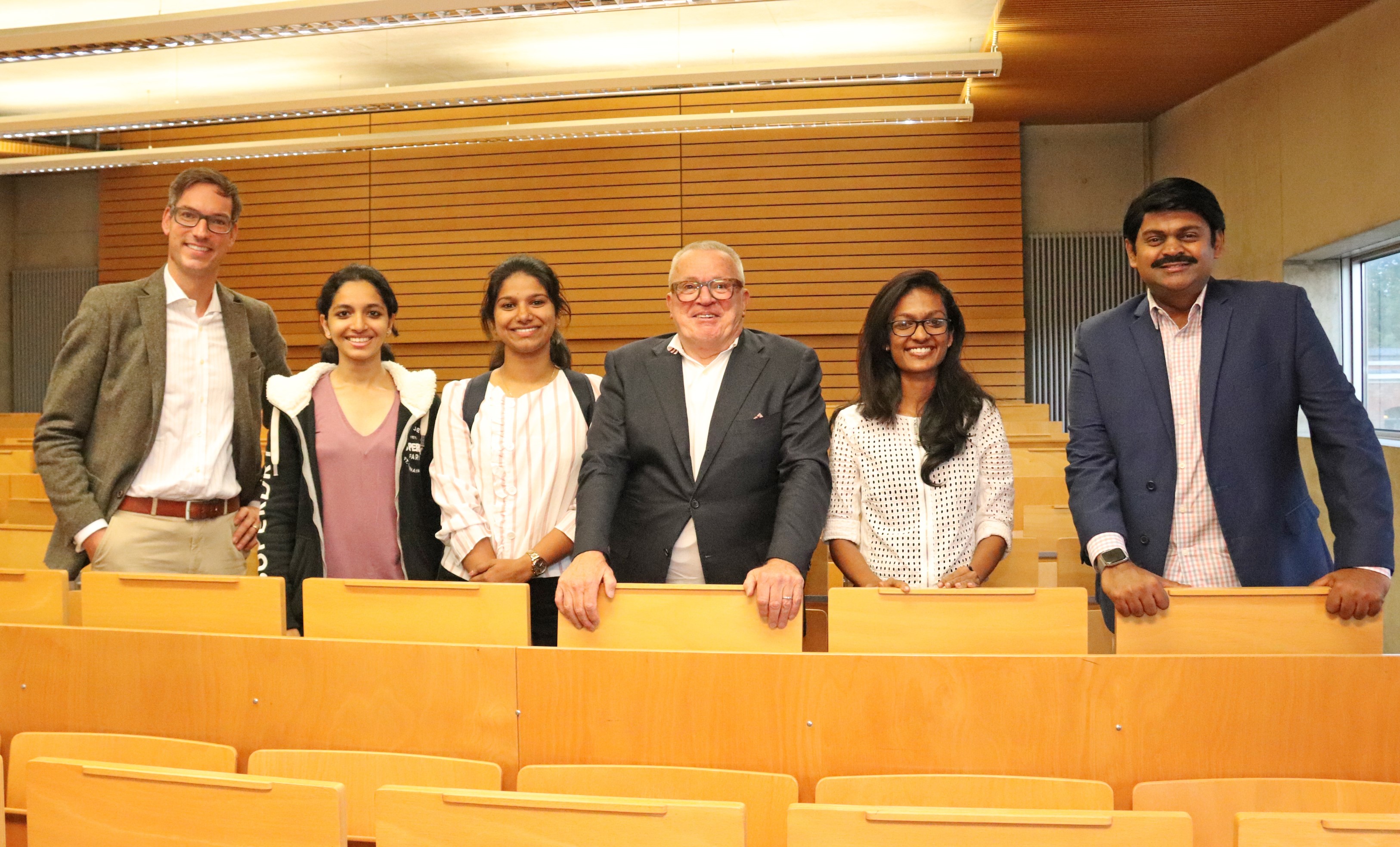 Thomas Sattelberger (Mitte) gemeinsam mit Prof. Dr. Alexander Danzer (Lehrstuhl für Volkswirtschaftslehre / Mikroökonomik; links), Prof. Dr. Shashi Matta (Lehrstuhl für Business Administration, Innovation and Creativity) sowie Teilnehmerinnen der Internationalen Sommerschule an der WFI.