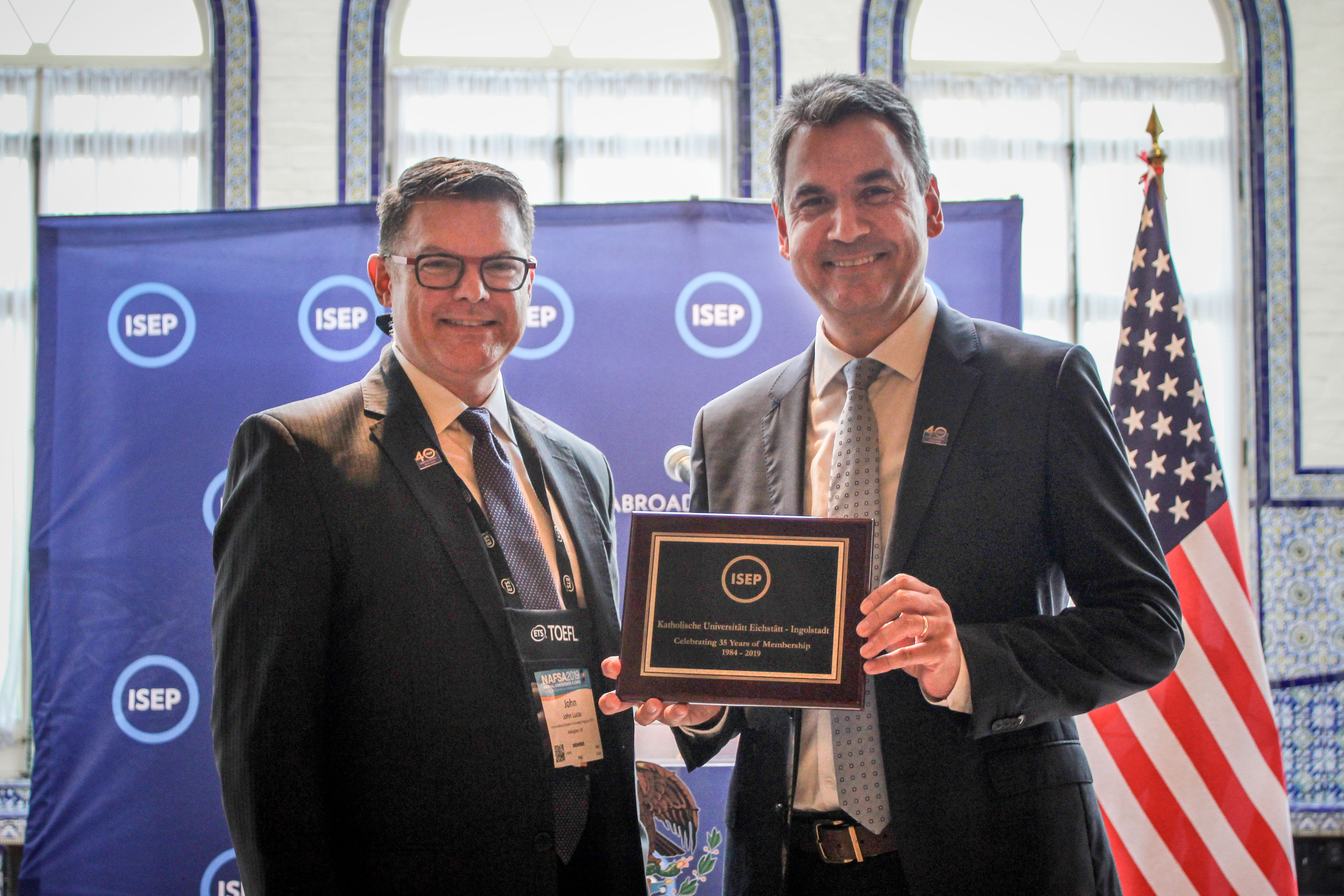 Der Präsident des International Student Exchange Program, Dr. John Lucas, überreichte KU-Vizepräsident Prof. Dr. Klaus Stüwe eine Gedenkplakette anlässlich der 35-jährigen Mitgliedschaft der KU bei ISEP. (Foto: upd)