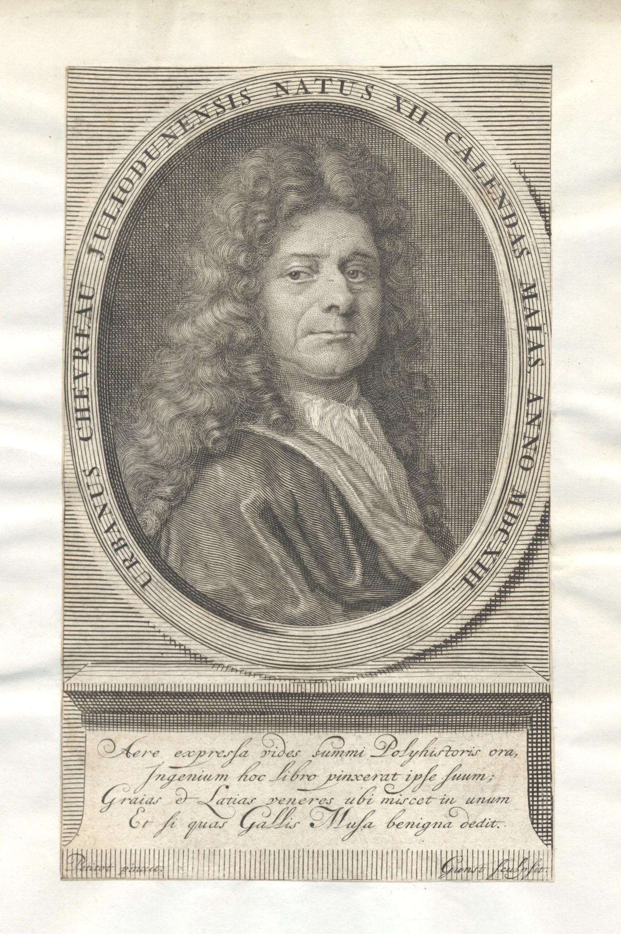«Frontispiz zu: Chevreau, Urbain: Chevraeana ... - Amsterdam : Thomas Lombrail, 1700. - Wiederverwendet als Frontispiz zu: Chevreau, Urbain: Oeuvres meslés. Tome premier. - Den Haag : Hendrik Scheurleer, 1717. - Vgl.: Katalog der graphischen Porträts in der Herzog August Bibliothek Wolfenbüttel 1500-1850, Reihe A: Die Porträtsammlung, Nr. A 3688. - Siehe auch: Allgemeiner Porträt-Katalog / hrsg. von Hans Dietrich von Diepenbroick-Grüter, S. 145, Nr. 4810. - Singer, Hans Wolfgang: Allgemeiner Bild...